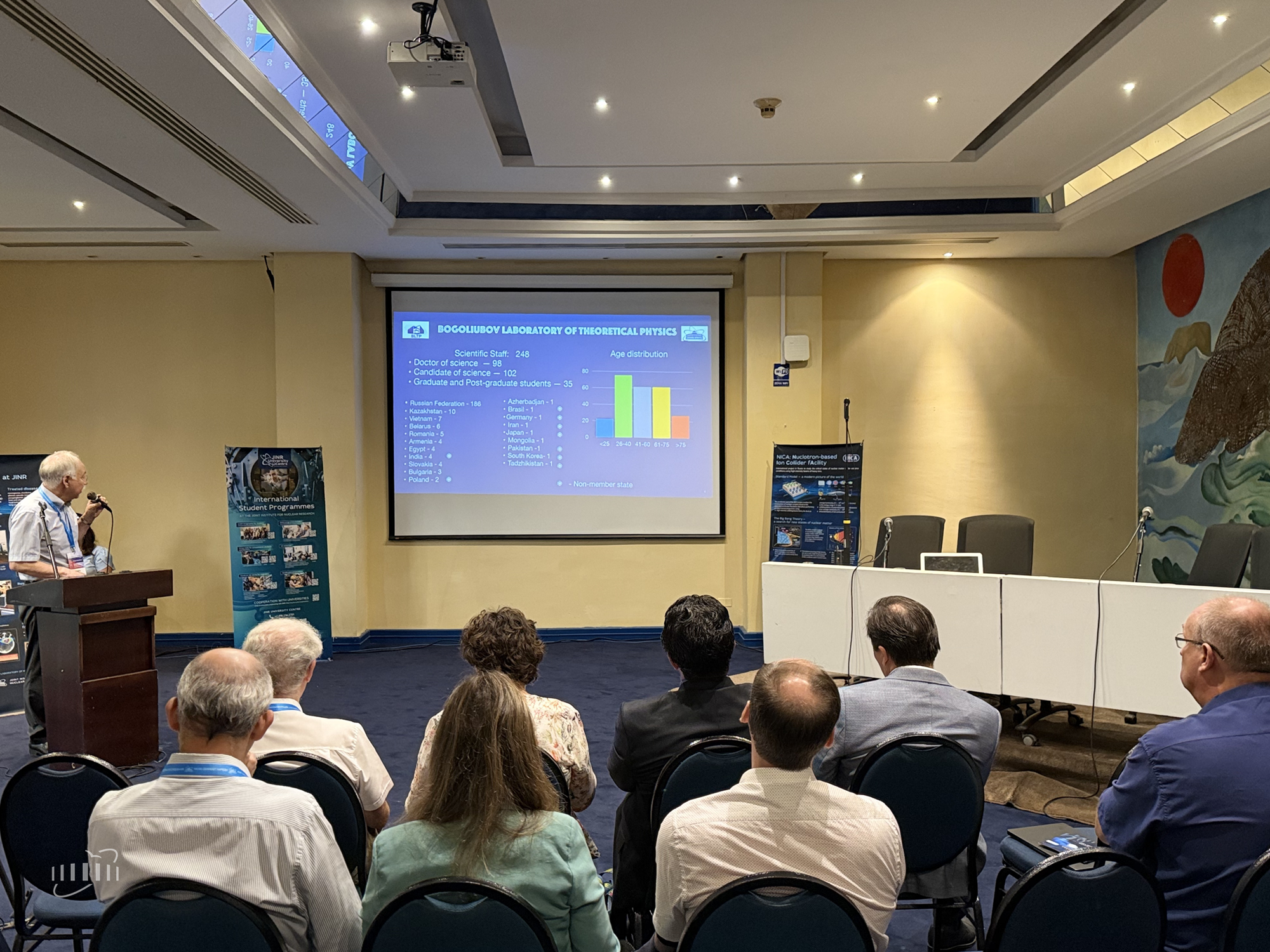 The workshop programme included talks on all major areas of research at JINR’s laboratories. The Institute was represented by Vice-Director Latchesar Kostov and leading scientists: Dmitry Kazakov (BLTP), Sergei Shmatov (MLIT), Aleksandr Bugay (LRB), Alexander Karpov (FLNR), Sergey Kulikov (FLNP), Viktor Riabov (VBLHEP), Alexey Guskov (DLNP), and Alexey Zhemchugov (DLNP).