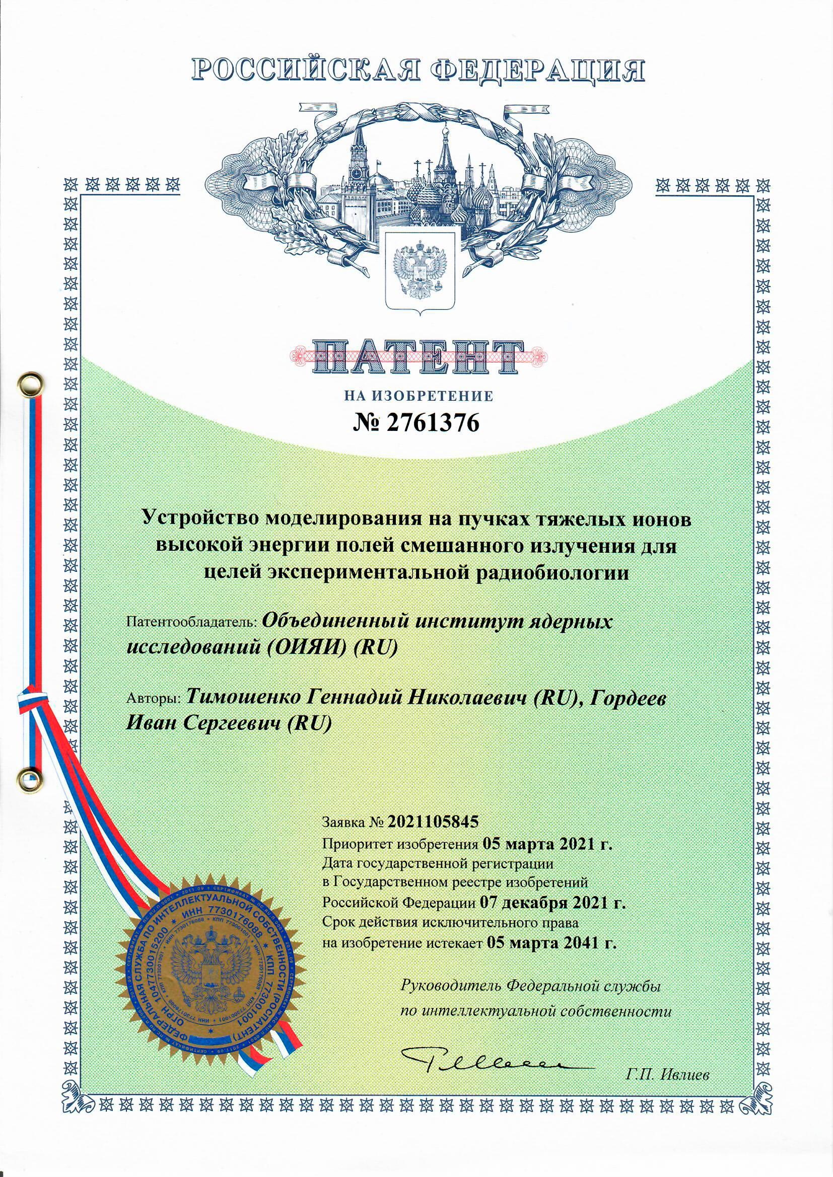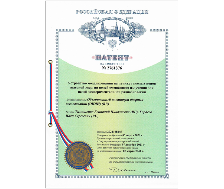 At the end of December 2021, the Joint Institute for Nuclear Research received a patent for the device used for modelling mixed radiation fields at high-energy heavy-ion beams for the purposes of experimental radiobiology. Employees of the Laboratory of Radiation Biology JINR Gennady Nikolaevich Timoshenko and Ivan Sergeevich Gordeev proposed the invention. In fact, the invention implies the creation of a simulator of the mixed radiation field inside a spacecraft in earth conditions. Particles of galactic space radiation (GSR) form this field during flights in deep space.