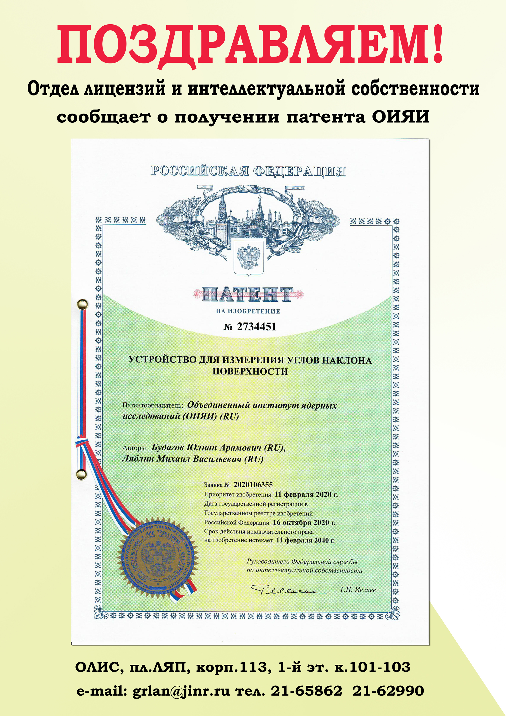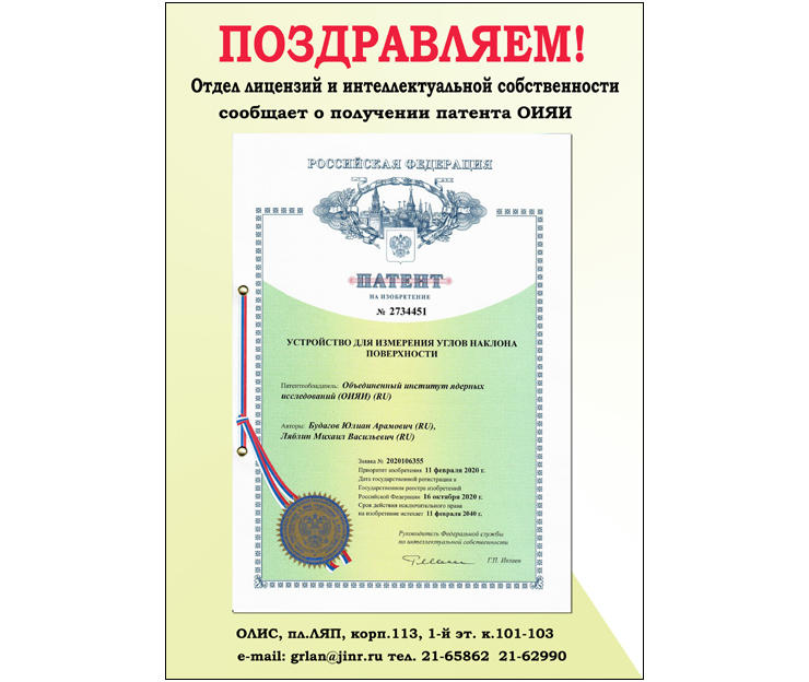 The Licensing and Intellectual Property Department of JINR announces that on 16 October 2020, the Joint Institute for Nuclear Research received a patent for the invention “Device for measuring angles of inclination of surface”. The authors of the work are Budagov Yulian Aramovich and Lyablin Mikhail Vasilevich.