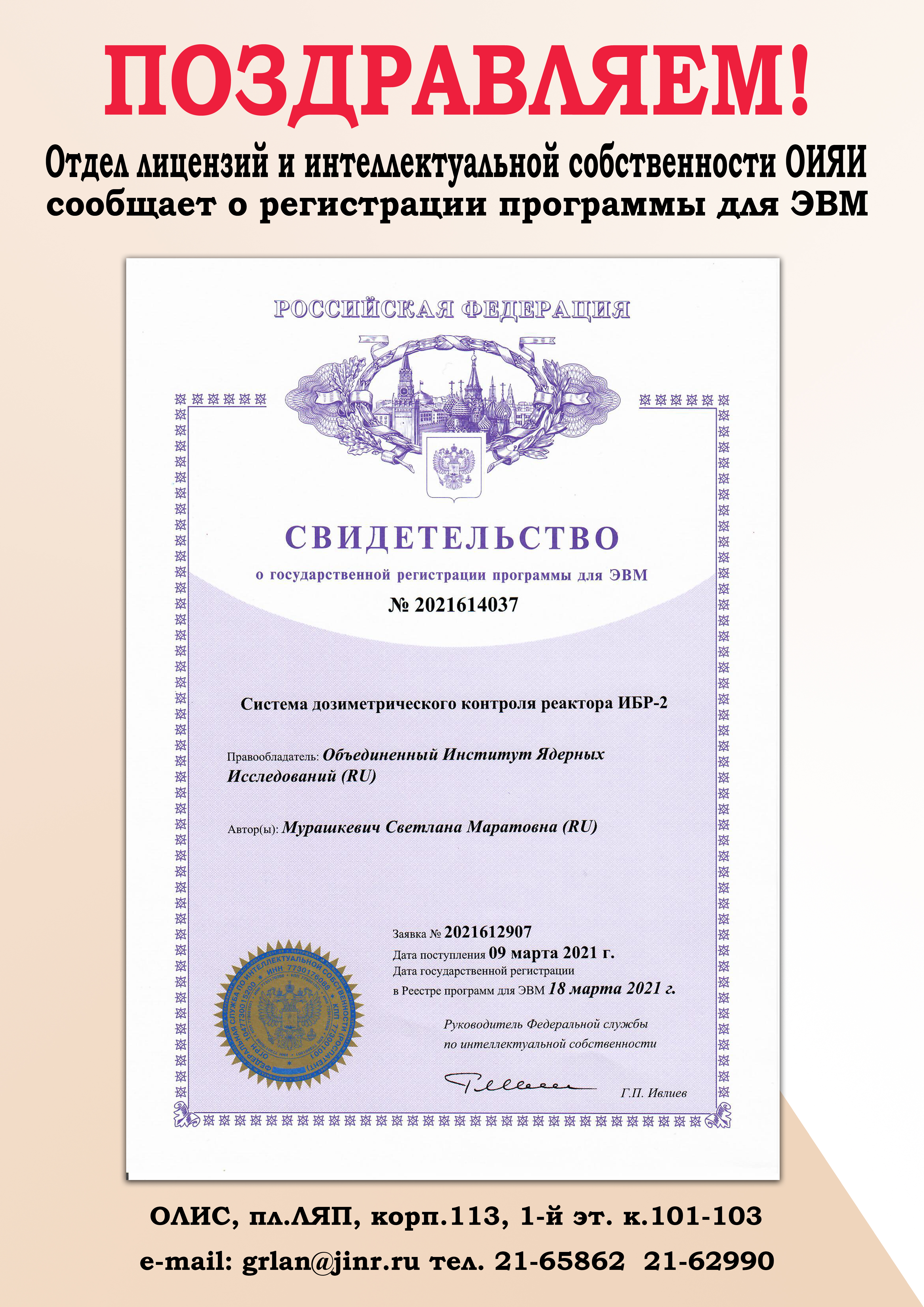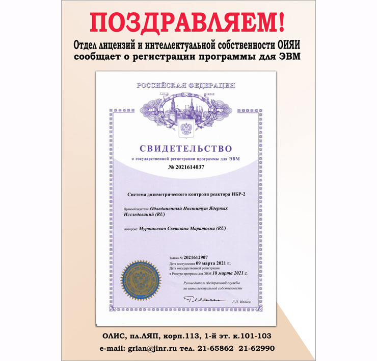 Отдел лицензий и интеллектуальной собственности ОИЯИ сообщает, что 18 марта 2021 года Объединенным институтом ядерных исследований было получено свидетельство о государственной регистрации программы для ЭВМ «Система дозиметрического контроля реактора ИБР-2». Автором работы является Мурашкевич Светлана Маратовна.