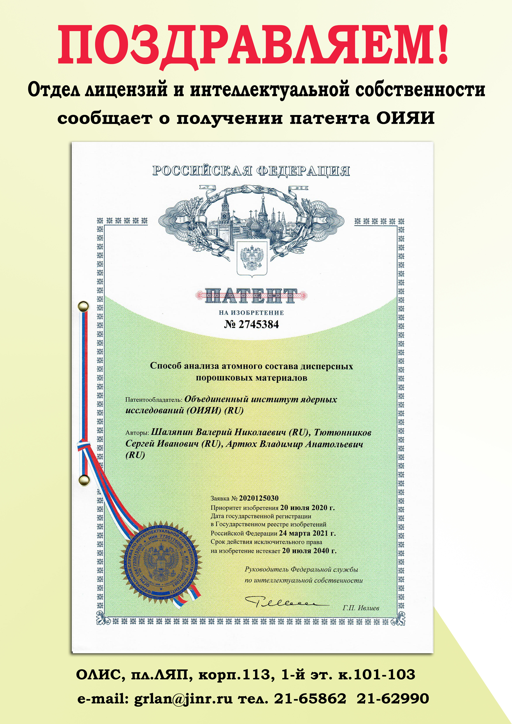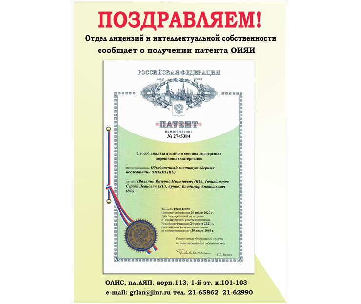 Отдел лицензий и интеллектуальной собственности ОИЯИ сообщает, что 24 марта 2021 года Объединенным институтом ядерных исследований был получен патент на изобретение «Способ анализа атомного состава дисперсных порошковых материалов». Авторами работы являются Шаляпин Валерий Николаевич, Тютюнников Сергей Иванович, Артюх Владимир Анатольевич.