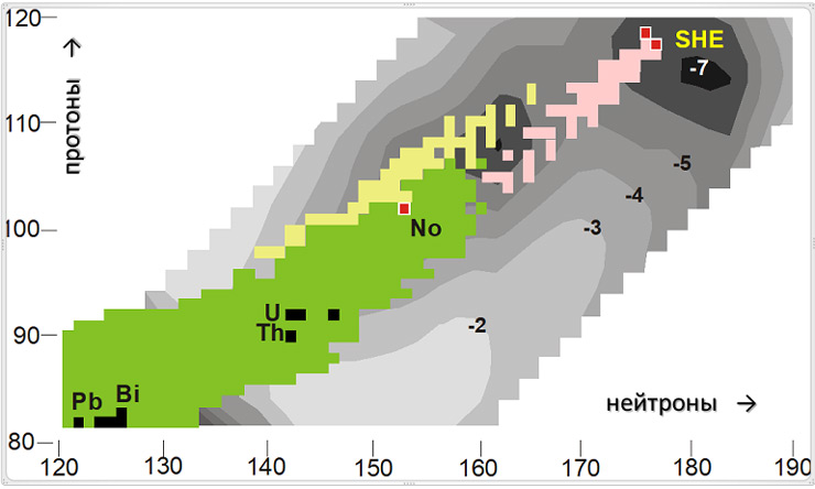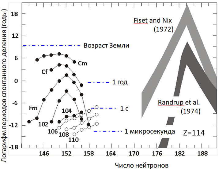 Ещё 60 лет назад такое макроскопическое, и в этом смысле классическое, описание процесса деления не вызывало сомнений. Особенно после синтеза первых искусственных элементов тяжелее урана, прекрасно подтверждающих капельную теорию деления: от урана (Z = 92) до калифорния (Z = 98) период полураспада относительно спонтанного деления уменьшился в 1014 раз [7]! Сомнения в прогнозах капельной модели деления возникли позже, после открытия в Лаборатории ядерных реакций им. Г.Н. Флёрова ОИЯИ спонтанно-делящихся изомеров (1962) [8]. Оказалось, что внутренняя структура ядра, наблюдаемая в основных состояниях, сохраняется и в сильно деформированных конфигурациях на пути к делению, продолжая играть важную роль в вероятности спонтанного деления тяжёлых ядер. Теперь уже более сложное описание коллективного движения в новой микроскопической теории давало одновременно также и новые предсказания границы масс ядер. Результаты оказались весьма неожиданными. Согласно прогнозам, резкое падение стабильности трансурановых нуклидов относительно спонтанного деления должно смениться резким подъёмом в области сверхтяжёлых элементов при подходе к “магическим” ядрам с числом протонов Z = 114 и нейтронов N = 184. Эти нуклиды, обладающие большим избытком нейтронов, более связаны. Они отделены от известной области ядер. Их достаточно много. На карте ядер они представляют собой подобие некого “острова” весьма тяжёлых (сверхтяжёлых) элементов, у которых могут быть очень долгоживущие изотопы. В научных статьях и докладах начала 1970-х годов можно найти различные иллюстрации, подобные той, что представлена на рис. 1.