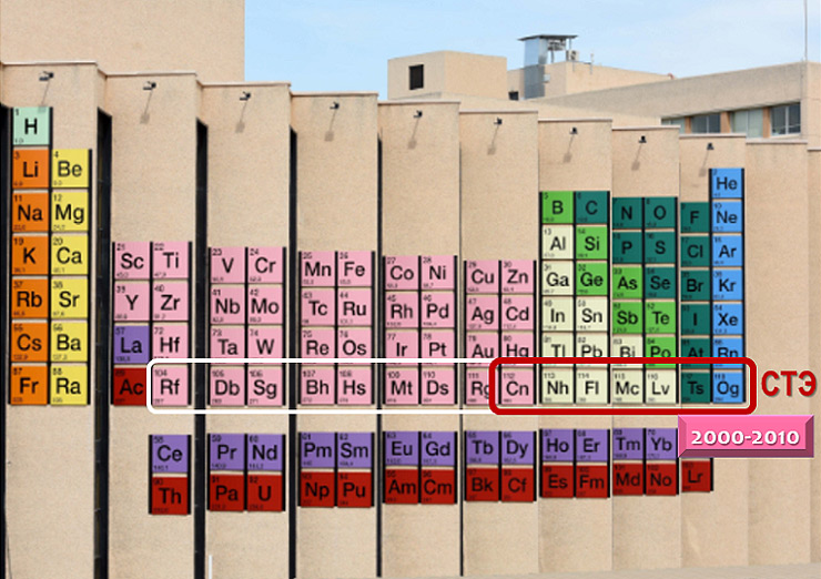 На фотографии (см. рис. 2, а) изображена самая большая (150 м2) Периодическая таблица химических элементов, встроенная в фасад химического факультета Университета г. Мурсия (Испания).** На ней красной рамкой выделены сверхтяжёлые элементы от 112-го до 118-го, полученные в реакциях с кальцием-48, когда в качестве материала мишени использовались тяжёлые изотопы от урана (Z = 92) до калифорния (Z = 98), соответственно***.
