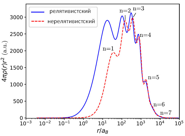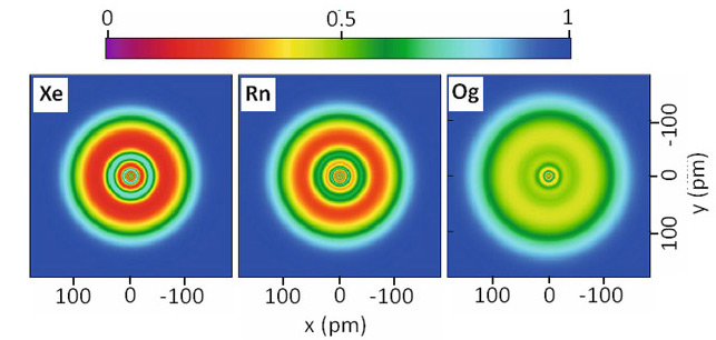 Но это первый звонок. Дальнейшее увеличение заряда ядра будет более ощутимым. Поэтому, спустя 100 лет после открытия Вильямом Рамзаем радона (1904) [17], последнего до 2004 года представителя семейства благородных газов 18 группы таблицы, мы задаемся сегодня вопросом: а будет ли 118-ый элемент благородным газом? Релятивистский эффект сильнее проявляется на ближайших к ядру электронах, скорость которых максимальна [18-20], что приводит к сжатию внутренних орбит (рис. 3, а). Для внешних электронов “релятивистское сжатие” приводит к экранированию положительного заряда ядра. В этой ситуации необходимо учитывать (пока в виде малых поправок) взаимодействие внешних электронов друг с другом, которое мало в природных элементах и которым пренебрегают в нерелятивистских расчётах. Нетрудно предвидеть, что роль этих поправок будет быстро возрастать с увеличением атомного номера в сверхтяжёлых элементах. Сам расчёт поправок – по сути, задача многих тел – требует огромных вычислительных мощностей. Большие надежды здесь связаны с квантовым компьютером. А пока доступными средствами в различном приближении отрабатываются методы расчёта на известных атомах, которые затем используются для предельно тяжёлых систем. Релятивистский расчёт элементов 18-й группы показывает, что пространственное распределение внешних электронов 118-го элемента [21] существенно размыто по сравнению с радоном и тем более с ксеноном (рис. 3, б). Подобная картина воспроизводится в расчётах В.М. Шабаева и его коллег [22], но указывается одновременно, что 118-й элемент на 94% будет благородным газом. Возможно, и не газом, а твёрдым телом при комнатной температуре [16,23].