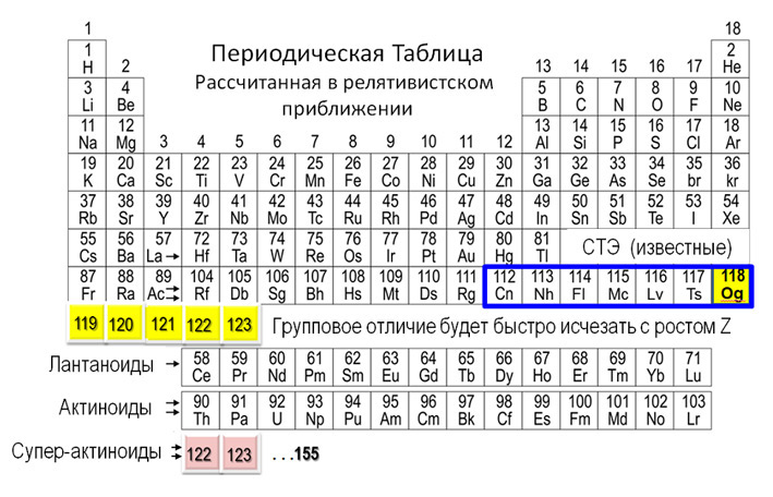 Рис. 4. Таблица Д.И. Менделеева с различными вариантами релятивистских расчетов. В синей рамке – сверхтяжёлые элементы, полученные в реакциях с пучком ионов кальция-48. |