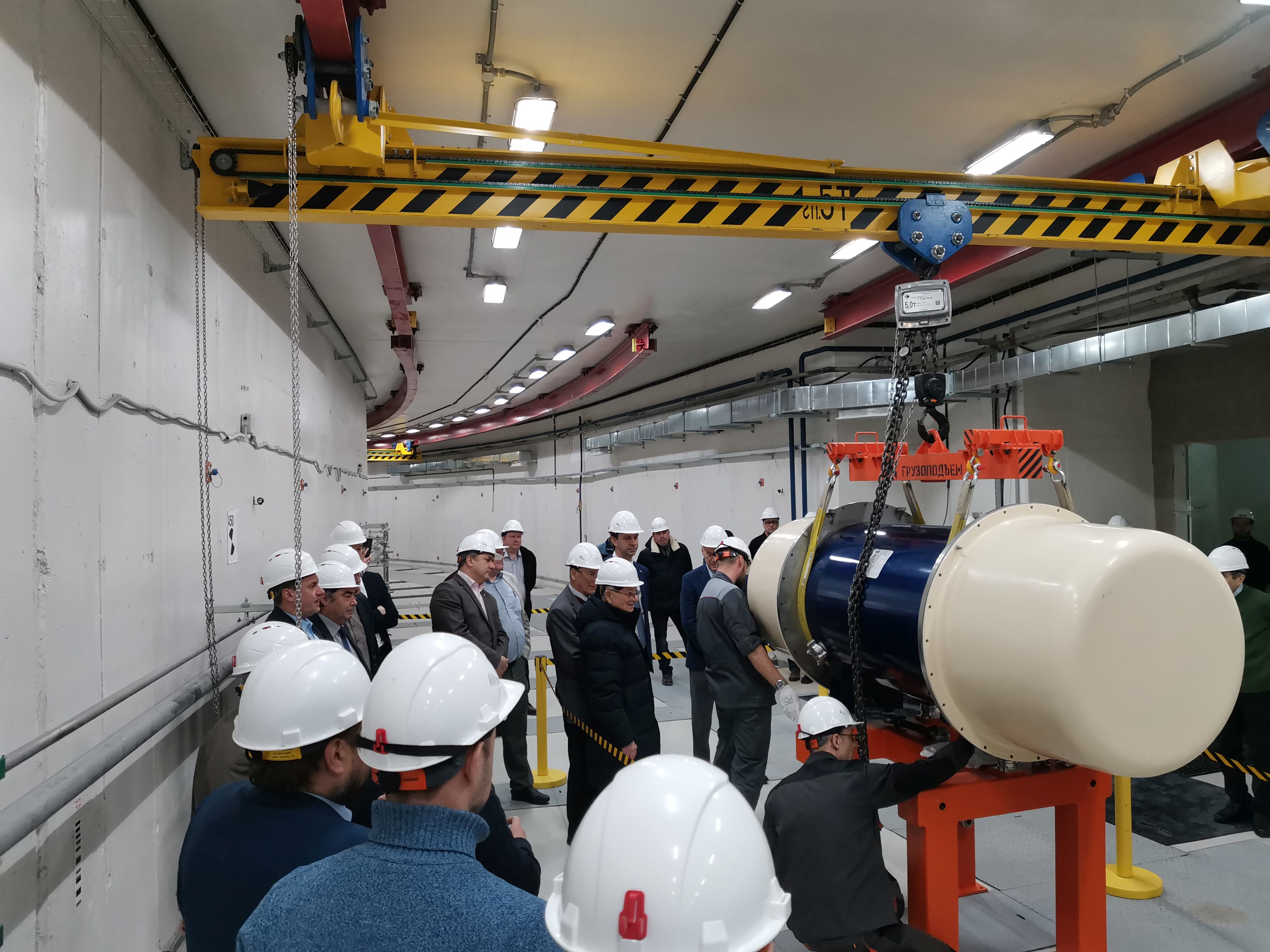 Торжественное событие началось в туннеле будущего коллайдера NICA, который полностью готов к началу монтажа криомагнитных модулей. На месте своей постоянной дислокации первый из 80 таких дипольных магнитов был символически закреплен директором ОИЯИ Григорием Трубниковым, научным руководителем Института Виктором Матвеевым, вице-директором ОИЯИ Владимиром Кекелидзе и научным руководителем Лаборатории ядерных реакций Юрием Оганесяном. Монтаж всех сверхпроводящих магнитов в туннеле коллайдера планируется завершить к концу следующего года, после чего будут начаты криогенные испытания.