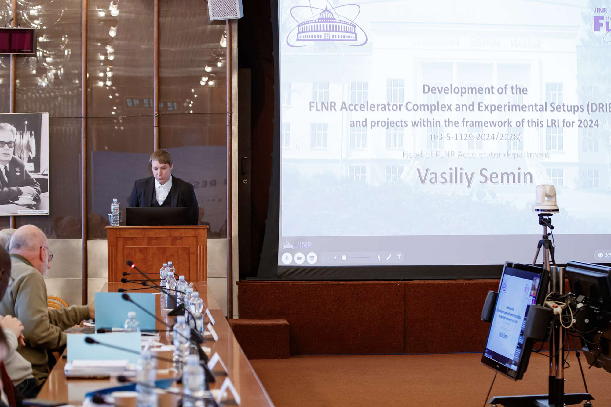 Начальник Научно-технологического отдела ускорителей ЛЯР Василий Семин ознакомил участников заседания с планами по развитию ускорительного комплекса и экспериментальных установок ЛЯР (DRIBs-III). Здесь одна из ключевых задач – завершение реконструкции циклотрона У-400М. «Мы находимся на последнем шаге модернизации установки. Уже начаты пусконаладочные работы, работы с пучком запланированы на март этого года», – отметил Василий Семин. Начата реализация проекта реконструкции ускорительного комплекса У-400, который включает в себя модернизацию самого ускорителя, строительство нового экспериментального корпуса, который сооружается с середины прошлого года, а также создание новых экспериментальных установок. Окончание строительства и выход на завершающую стадию модернизации циклотрона У-400 запланированы на 2026 год. Идет разработка концепции двух новых установок, которые будут расположены в строящемся здании нового циклотрона У-400Р – STAR и SCIF-D, направленных на изучение реакций многонуклонных передач.