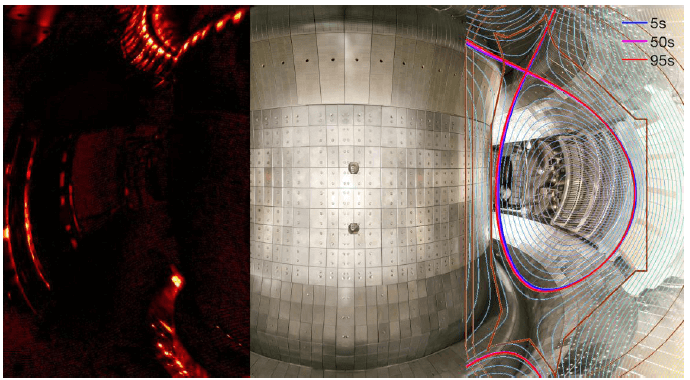 Различные конфигурации магнитного поля в токамаке EAST при разных временах удержания плазмы (справа), и вид внутренней части вакуумной камеры во время горения разряда (слева). Центральная часть плазменного шнура в оптическом диапазоне не видна, свечение исходит из периферийных областей с более холодной плазмой, содержащей примеси. Photo: EAST Team