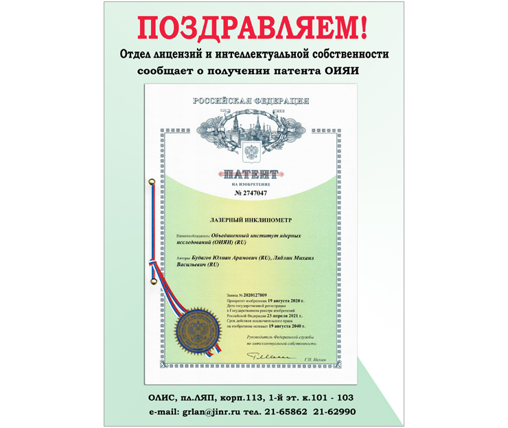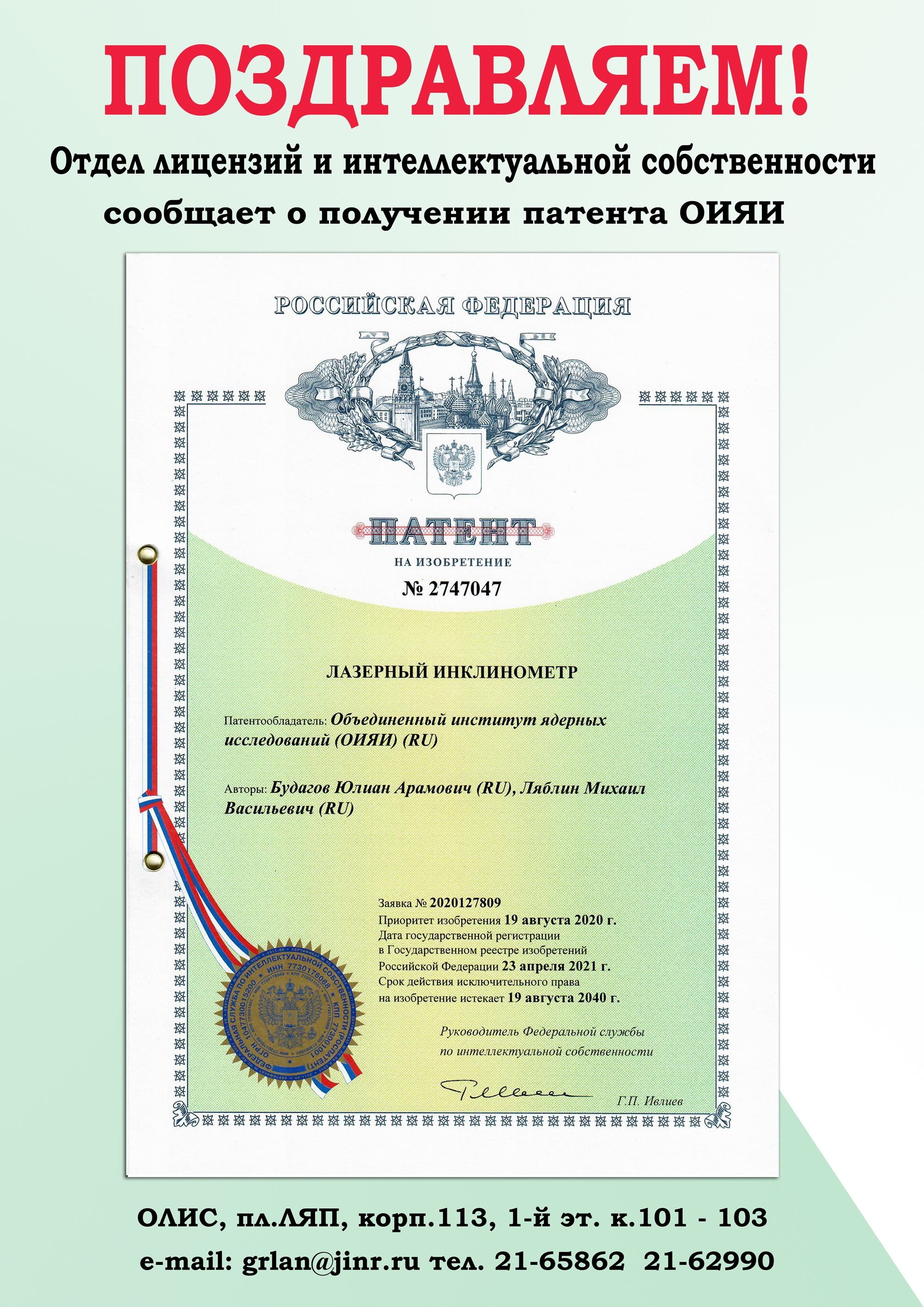 Отдел лицензий и интеллектуальной собственности ОИЯИ сообщает, что 23 апреля 2021 года Объединенным институтом ядерных исследований было получен патент на изобретение «Лазерный инклинометр». Авторами работы являются Будагов Юлиан Арамович и Ляблин Михаил Васильевич.