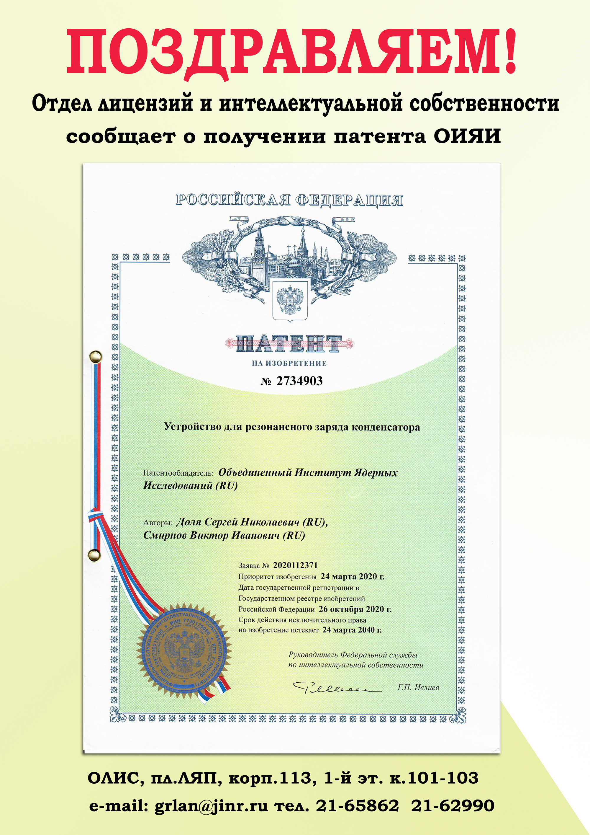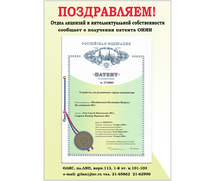 Отдел лицензий и интеллектуальной собственности ОИЯИ сообщает, что 26 октября 2020 года Объединенным институтом ядерных исследований был получен патент на изобретение «Устройство для резонансного заряда конденсатора». Авторами работы являются Доля Сергей Николаевич и Смирнов Виктор Иванович.