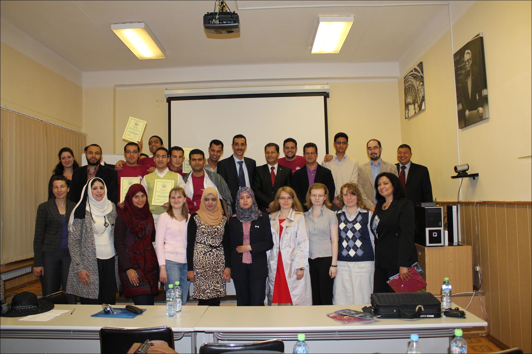 The guests participated in the closing ceremony of the 4th Practice for young researchers from Egypt at JINR, which had been held in the JINR University Center from 14 May to 1 June 2012. The Counsellor listened with interest to reports of students which they prepared after three weeks of the Practice in the frames of educational research projects at JINR Laboratories, handed them certificates of successful finishing of the Practice, and expressed his confidence in great prospects of cooperation between Egypt and JINR. The guests visited the Flerov Laboratory of Nuclear Reactions and saw the sights of Dubna. On the JINR side the guests were welcomed by JINR Chief Scientific Secretary Professor N.A.Russakovich, FLNR Senior Researcher and Dean of the Faculty of Natural Sciences and Engineering of the University "Dubna" A.S.Denikin, ICD Coordinator of the JINR-ARE cooperation E.V.Pryanichnikova.