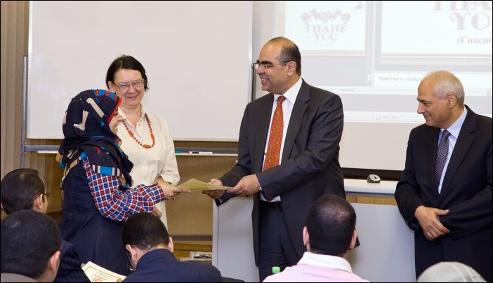 Гости приняли участие в закрытии Практики для студентов из Египта, проходившей в УНЦ ОИЯИ в течение трех недель. Посол собственноручно вручил сертификаты об успешном окончании Практики студентам, и выразил уверенность в больших перспективах развития сотрудничества между Египтом и ОИЯИ. Гости ознакомились с работой Лаборатории ядерных проблем по протонной терапии и осмотрели достопримечательности города Дубны. Со стороны ОИЯИ с гостями встречались профессор Р. Ледницки, вице-директор, Н.А. Русакович, главный ученый секретарь, С.З. Пакуляк, директор Учебно-научного центра, Е.В. Пряничникова, координатор по сотрудничеству с Египтом от ОМС. Посол проявил большой интерес к фундаментальным и прикладным исследованиям ОИЯИ и выразил желание посетить Дубну еще раз в ближайшем будущем.