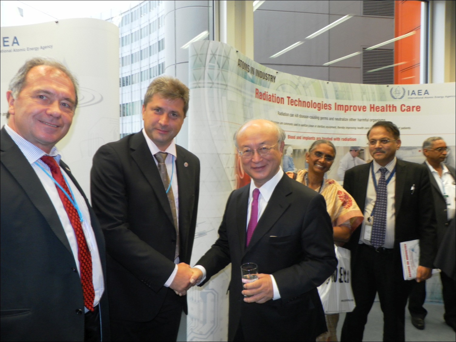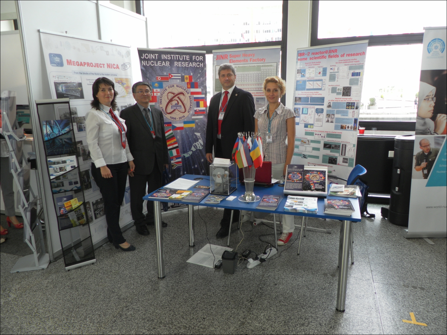 Информационные материалы ОИЯИ, представленные на Генеральной конференции МАГАТЭ привлекали внимание значительного числа делегатов. Экспозиция Института начала работу 14 сентября, за три последующих дня представители многих национальных делегаций стран-участниц и стран-ассоциированных членов ОИЯИ подробно ознакомились с информацией об Институте; с делегацией ОИЯИ обсуждались рабочие вопросы сотрудничества и предстоящие праздничные мероприятия, посвященные 60-летию Института. 16 сентября стенд ОИЯИ посетил Полномочный представитель Монголии в ОИЯИ Сурэн Даваа.