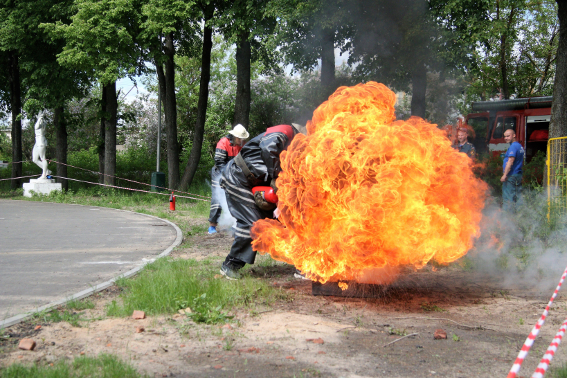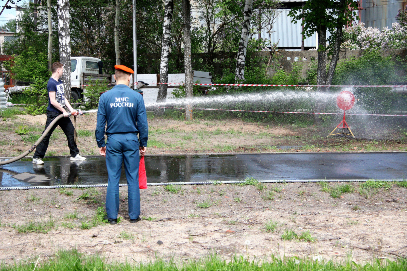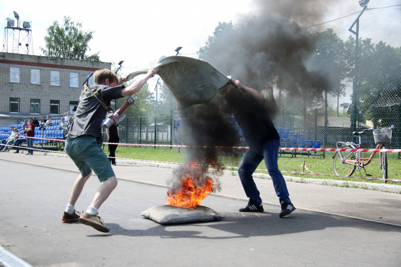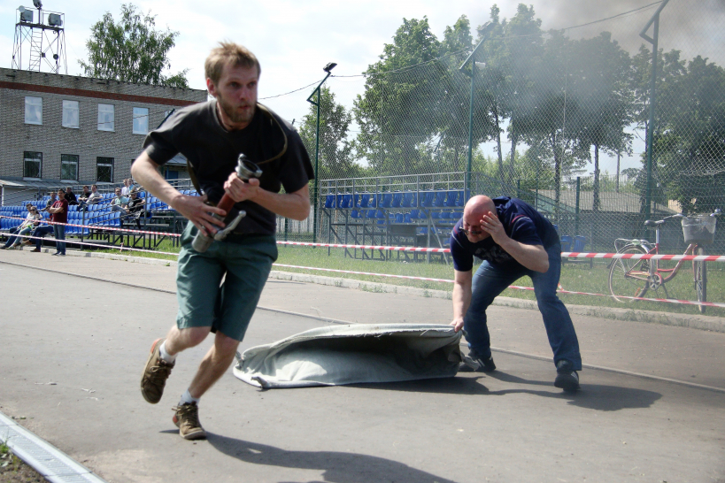 Дружинники состязались в эстафете, состоящей из четырех этапов: стометровка, тушение горящего чучела, развертывание пожарного рукава и «наполнение» водой мишени, тушение горящих противней огнетушителями в полном обмундировании. При этом импровизированной эстафетной палочкой выступает пожарный ствол, который участники передают друг другу на каждом этапе.