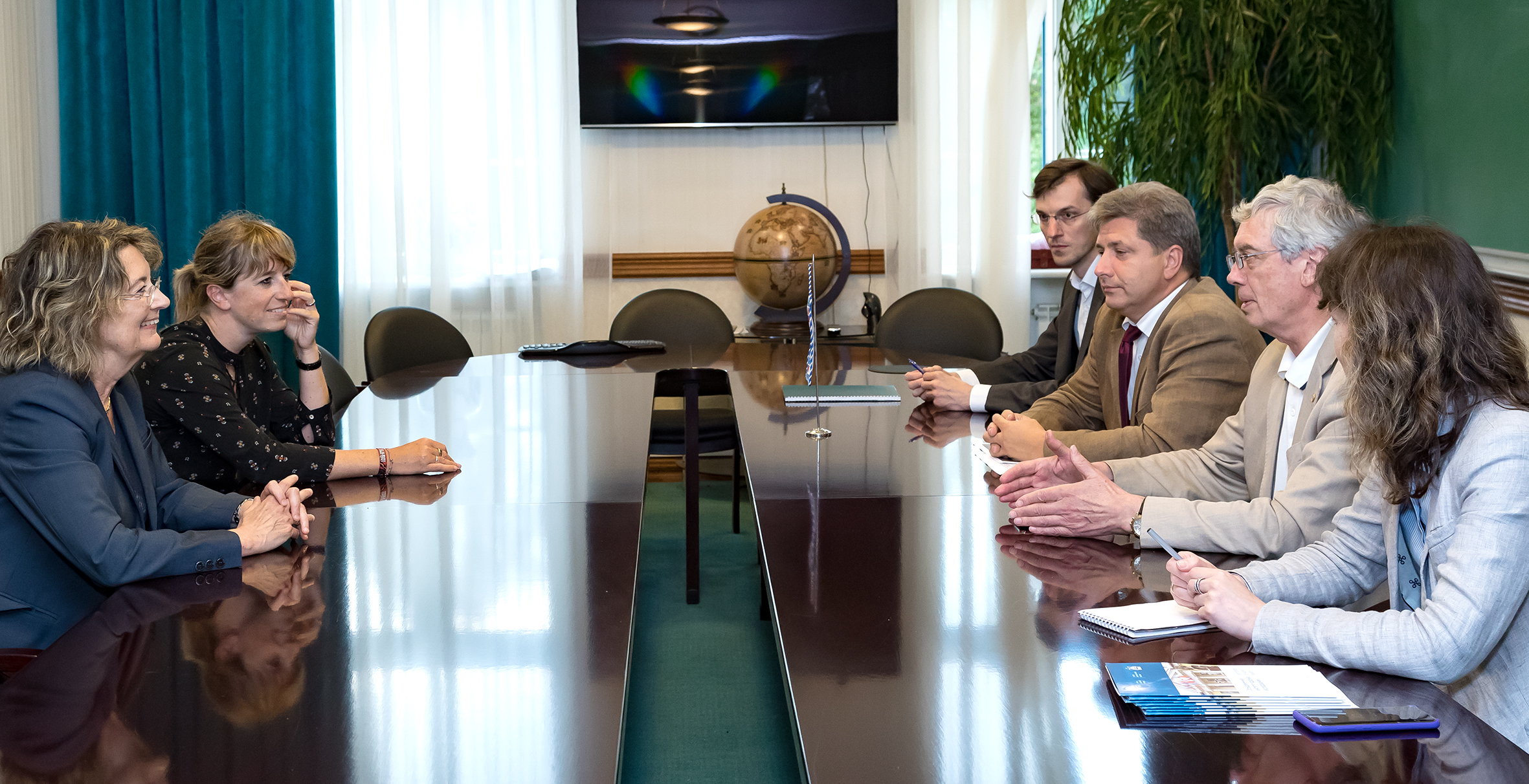 В Дирекции ОИЯИ гостей приветствовали вице-директор ОИЯИ Б.Ю. Шарков, заместитель начальника Финансово-экономического управления М.П. Васильев, начальник Отдела международных связей Д.В. Каманин, заместитель начальника Отдела А.А. Котова. Участники встречи обсудили возможности дальнейшего развития сотрудничества, в частности возможность включения одного из флагманских проектов ОИЯИ «Baikal-GVD» в дорожную карту Европейского стратегического форума по исследовательским инфраструктурам (ESFRI). Гости отметили, что на данный момент проект «Baikal-GVD» уже привлек внимание APPEC и мнение членов организации о нем самое благоприятное. Также, по мнению участников встречи, намеченные совместные шаги послужат более широкому распространению информации о научных исследованиях и возможностях ОИЯИ в европейских странах.