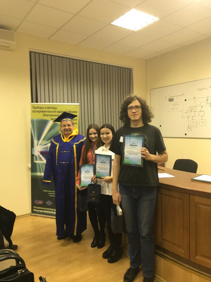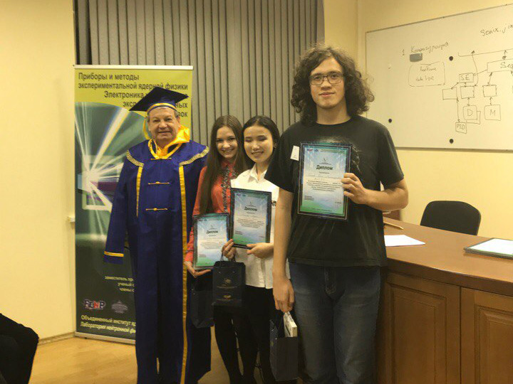 Говоря о практических занятиях школы, С. А. Куликов заметил, что на практике ребята знакомятся с новыми устройствами – и с детекторной частью, и с криогенной электроникой, но основная задача программы – это базовые знания, которые можно применить на практике на спектрометрах ЛНФ. В практических занятиях ребята работают с настоящим, современным оборудованием, которое используется сегодня в экспериментах. Как всегда во время школы проводился конкурс докладов, на который в этот раз было заявлено свыше десяти работ. Все участники школы получили сертификаты, а победители конкурса докладов – памятные призы.
