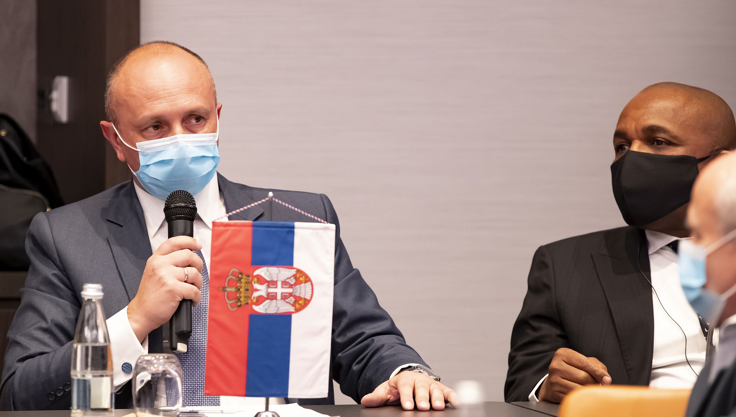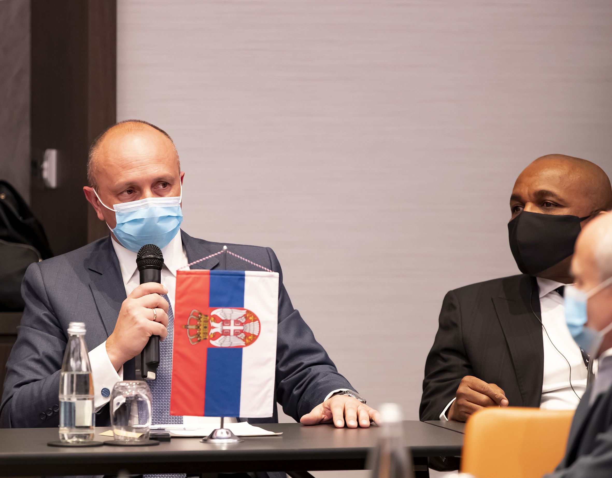 Heads of the diplomatic missions of a number of the JINR Member States in Bulgaria took part in the ceremonial event: Ambassadors Extraordinary and Plenipotentiary Ms Eleonora Mitrofanova (Russia), Mr Alexander Lukashevich (Belarus) together with a senior adviser of the Embassy of Belarus in Bulgaria Nikolay Poznyak, Ms Sayana Lkhagvasuren (Mongolia), Ms Brandusa Brândușa (Romania), representative of the diplomatic mission of Egypt Mr Mustafa Hami. Diplomats of JINR Associate Members made speeches at the festive session: Ambassador Extraordinary and Plenipotentiary of Serbia to Bulgaria Zeljko Jovic, Ambassador Extraordinary and Plenipotentiary of South Africa Mr Thabo Tahe.