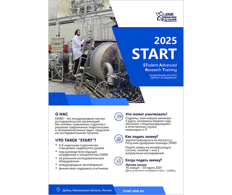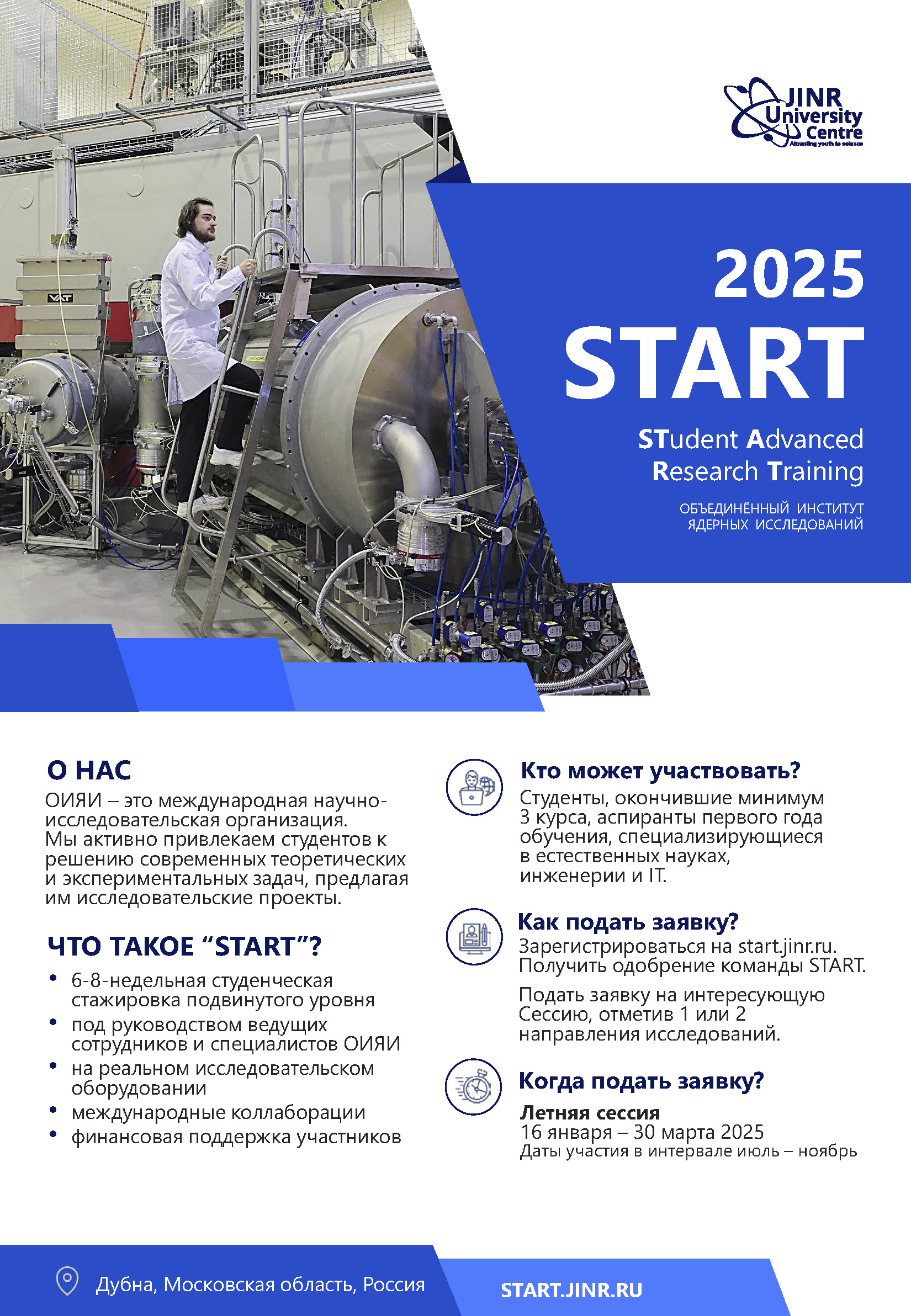 Программа START (STudent Advanced Research Training) приглашает студентов и аспирантов присоединиться к научно-исследовательской работе в Объединенном институте ядерных исследований под руководством ведущих ученых и инженеров. Прием заявок на Летнюю сессию 2025 года ведется на сайте start.jinr.ru до 31 марта 2025 года.