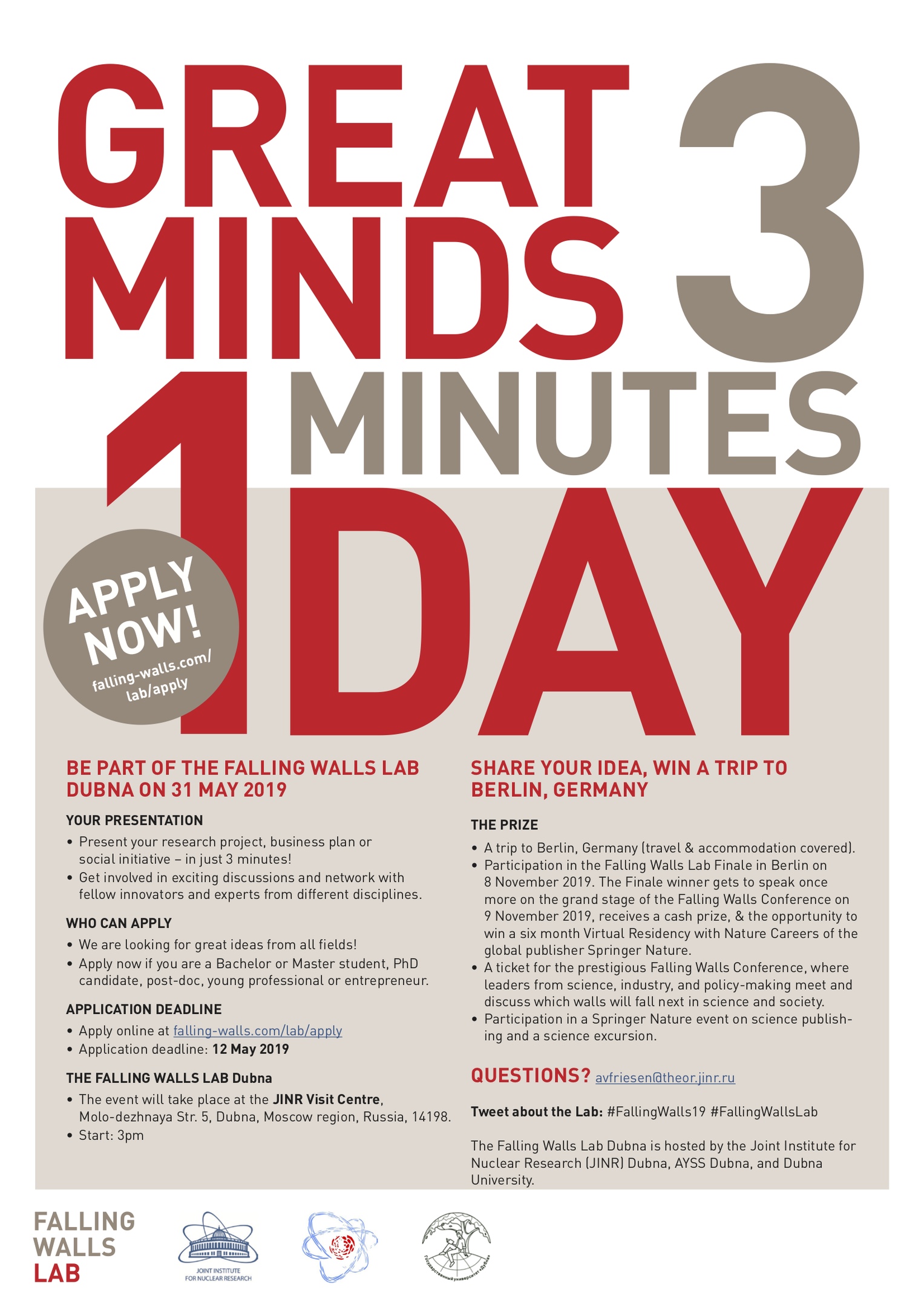 Информируем вас, что прием заявок на участия в форуме Falling Walls Lab Dubna 2019 продлен до 20 мая. Заявки на участие подаются в электронном виде по адресу https://falling-walls.com/lab/apply.