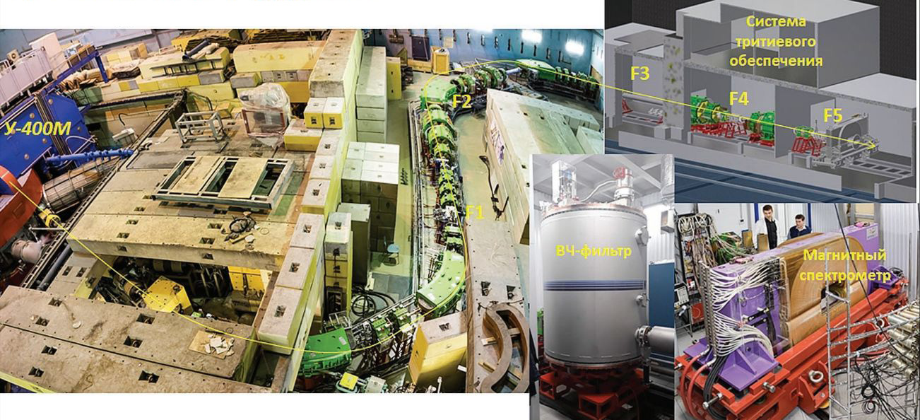 В 2014 году все элементы фрагмент-сепаратора АКУЛИНА-2, представляющие собой 53-метровую S-образную линию транспортировки первичного пучка от ускорителя до производящей мишени в зоне F1 и вторичных фрагментов из F1 в F5 (фото 2), были установлены и отъюстированы в 3D-пространстве с точностью 100 микрон. В декабре 2015 года состоялся технический пуск установки с первичным пучком, в 2016-м были получены первые радиоактивные пучки в конечной фокальной плоскости сепаратора F5, а в 2017 году начались первые эксперименты. Важно отметить, что все расчетные параметры установки (выход фрагментов в единицу времени, коэффициент очистки от примесей, поперечный размер пучка в фокальных плоскостях) были подтверждены экспериментально. Теперь В. Бикман будет говорить: «Мы построили не только прецизионную установку, но и прочные дружеские отношения». Прочность отношений была подкреплена последующими двумя контрактами с фирмой SIGMAPHI на изготовление дипольного магнита как части спектрометра нулевых углов в F5 (2017 год) и высокочастотного фильтра для очистки вторичного пучка от примесей в плоскости F3 (2019-й). В этом году совместно с сотрудниками РФЯЦ ВНИИЭФ (г. Саров) и ДЗХМ (г. Дзержинск) установка будет укомплектована уникальным оборудованием (единственным в мире) для работы с криогенной тритиевой мишенью. Это даст новые возможности для изучения нейтроноизбыточных изотопов, далеко отстоящих от границы стабильности, таких как 7H, 10He, 13Li, 16Be и другие.
