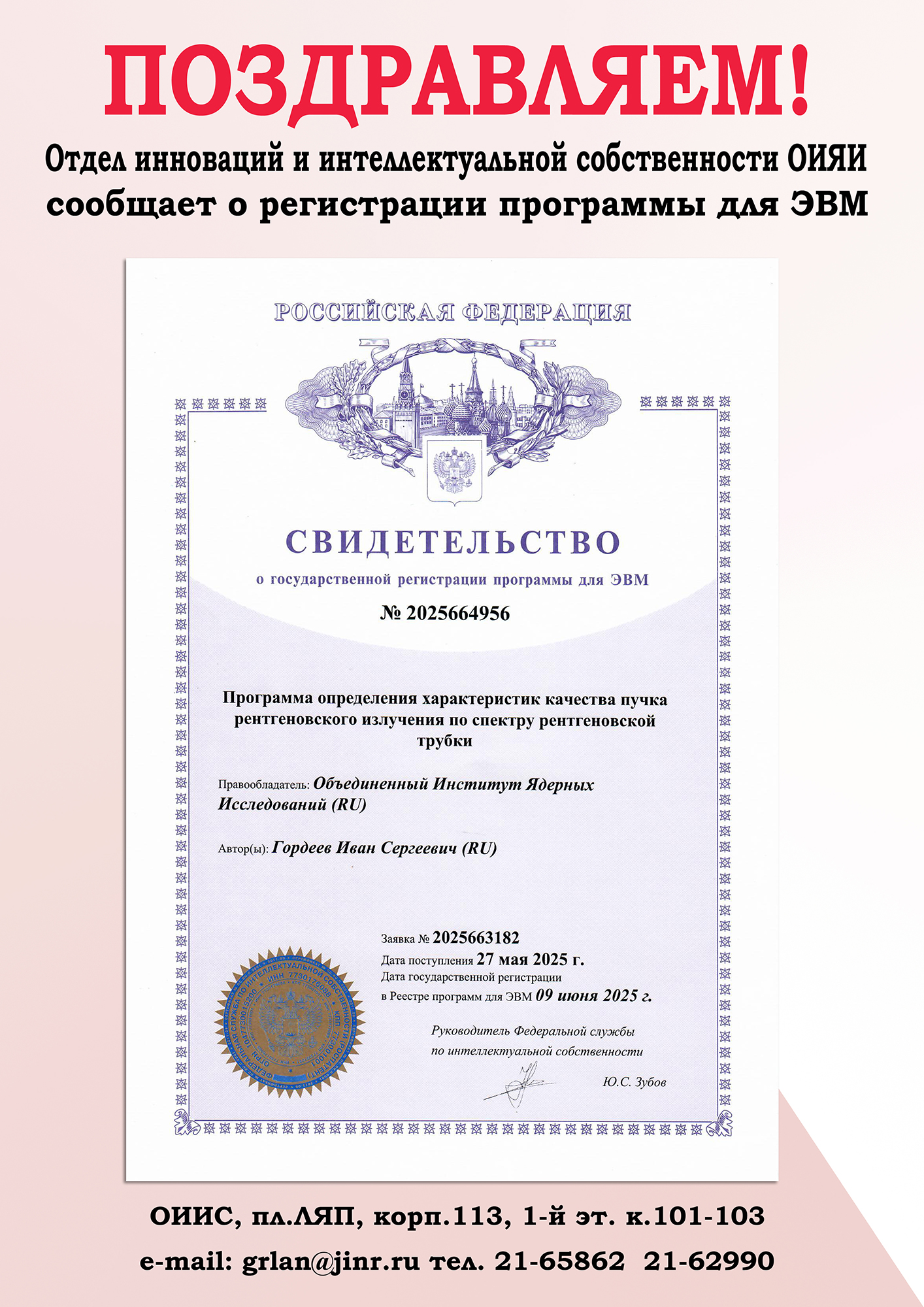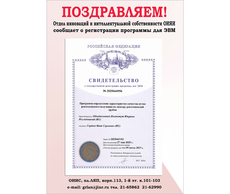 The JINR Department of Innovation and Intellectual Property announces that on 9 June 2025, the Joint Institute for Nuclear Research received a certificate of state registration of a program for assessing ray beam quality based on the X-ray tube spectrum. The author is Ivan Gordeev (LRB).