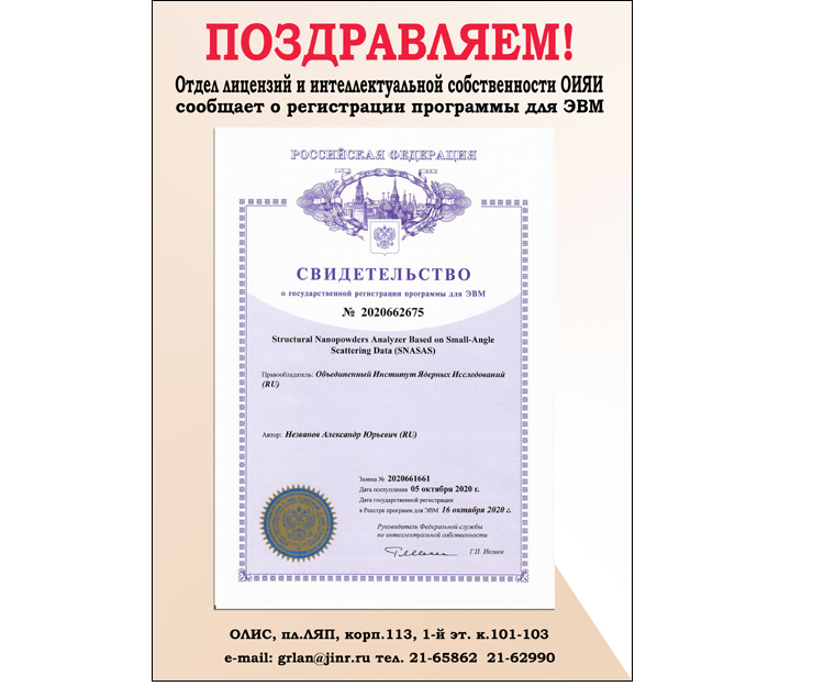 Отдел лицензий и интеллектуальной собственности ОИЯИ сообщает, что 16 октября 2020 года Объединенным институтом ядерных исследований было получено свидетельство о государственной регистрации программы для ЭВМ «Structural nanopowders analyzer based on small-angle scattering data». Автором работы является Незванов Александр Юрьевич.
