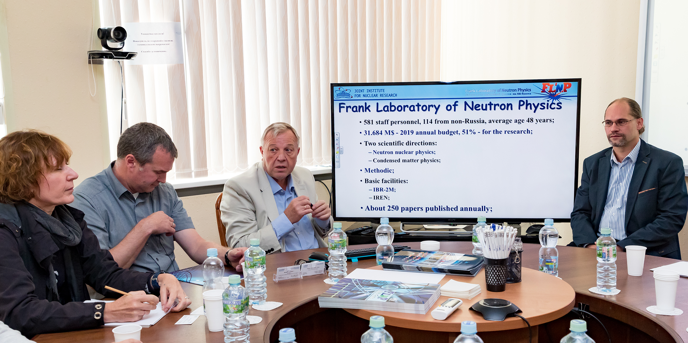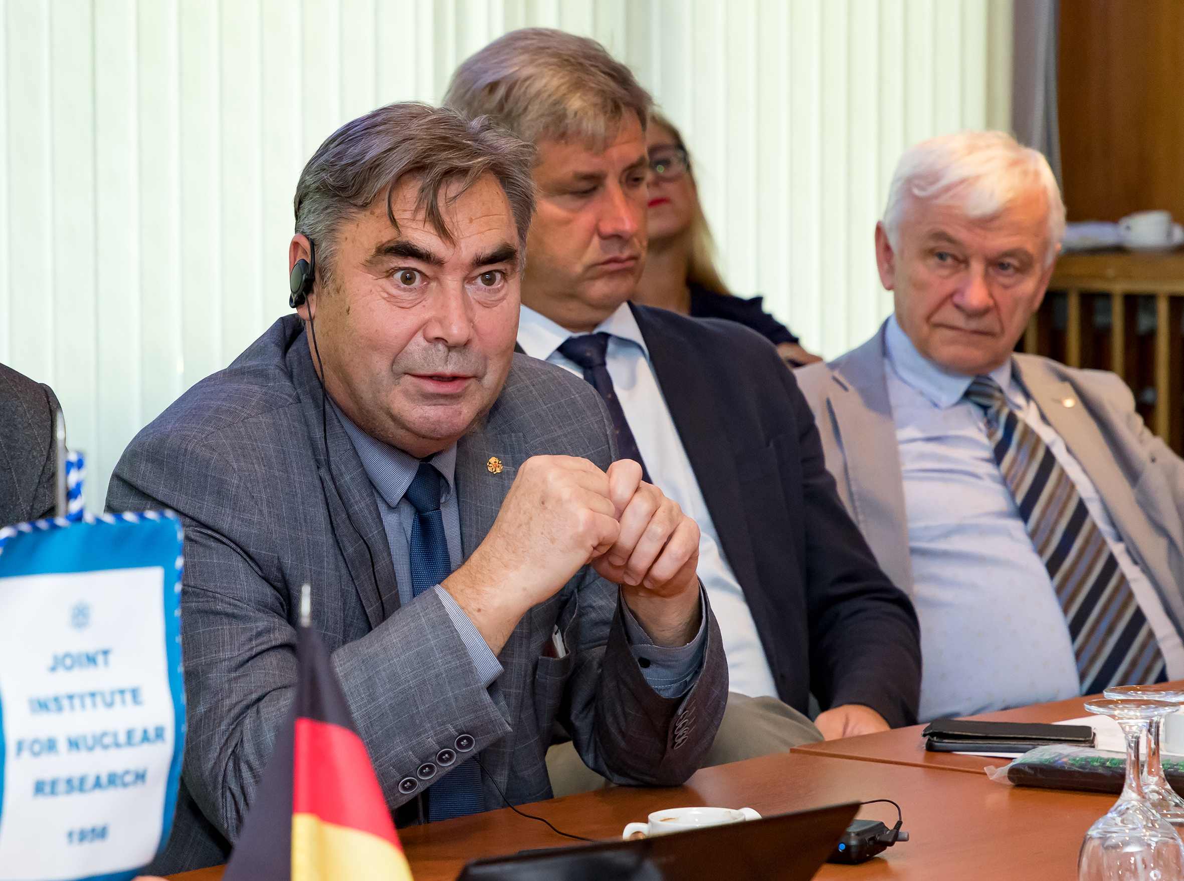 Визит завершила встреча с представителями руководства ОИЯИ и обширной тематической дискуссией, в которой от ОИЯИ принимали участие вице-директора Р. Ледницки и В. Д. Кекелидзе, главный инженер Б. Н. Гикал, заместитель директора ОИЯИ по персоналу А. В. Рузаев, начальник Отдела международных связей Д. В. Каманин и его заместитель А. А. Котова, директор ЛНФ В. Н. Швецов, заместитель директора УНЦ ОИЯИ А. С. Жемчугов, начальник отдела ЛФВЭ С. А. Костромин.