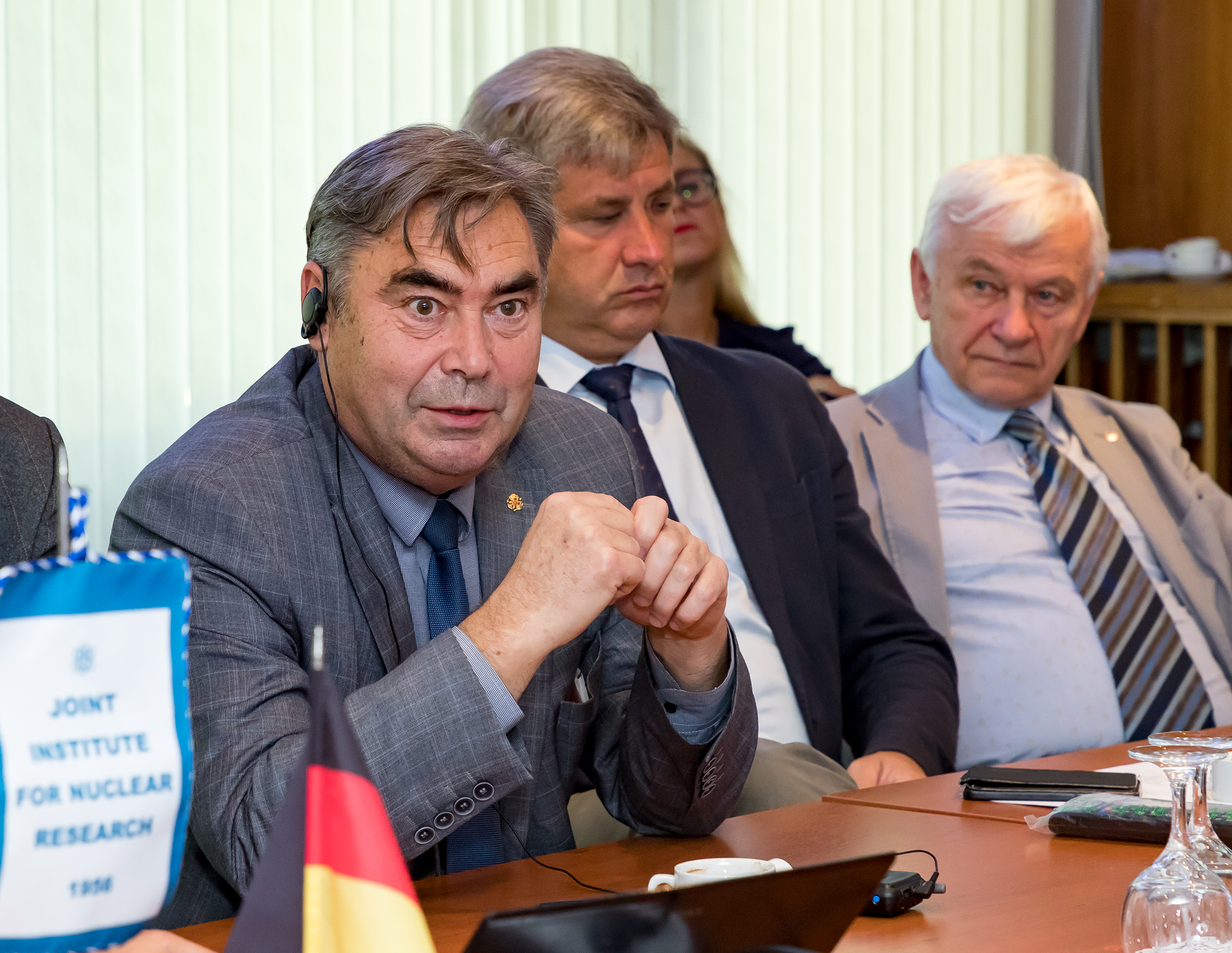 Визит завершила встреча с представителями руководства ОИЯИ и обширной тематической дискуссией, в которой от ОИЯИ принимали участие вице-директора Р. Ледницки и В. Д. Кекелидзе, главный инженер Б. Н. Гикал, заместитель директора ОИЯИ по персоналу А. В. Рузаев, начальник Отдела международных связей Д. В. Каманин и его заместитель А. А. Котова, директор ЛНФ В. Н. Швецов, заместитель директора УНЦ ОИЯИ А. С. Жемчугов, начальник отдела ЛФВЭ С. А. Костромин.