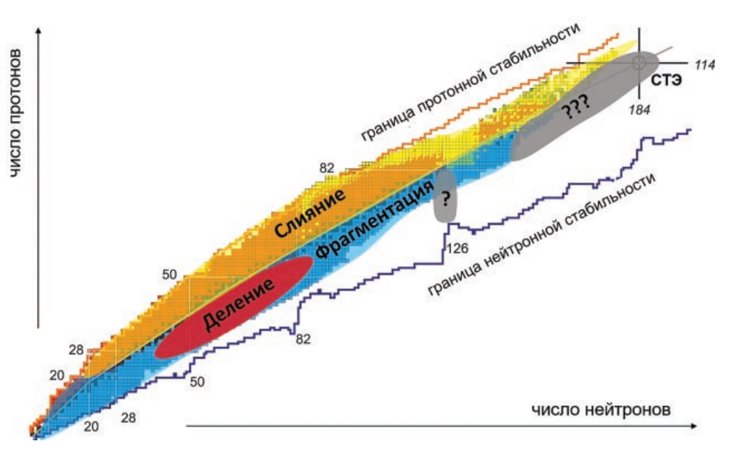 Карта известных ядер, а также схематическое изображение основных способов их получения