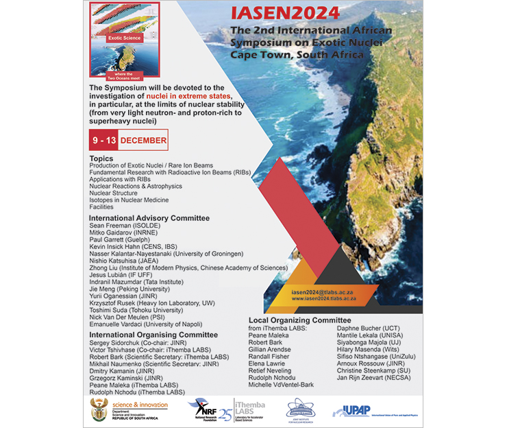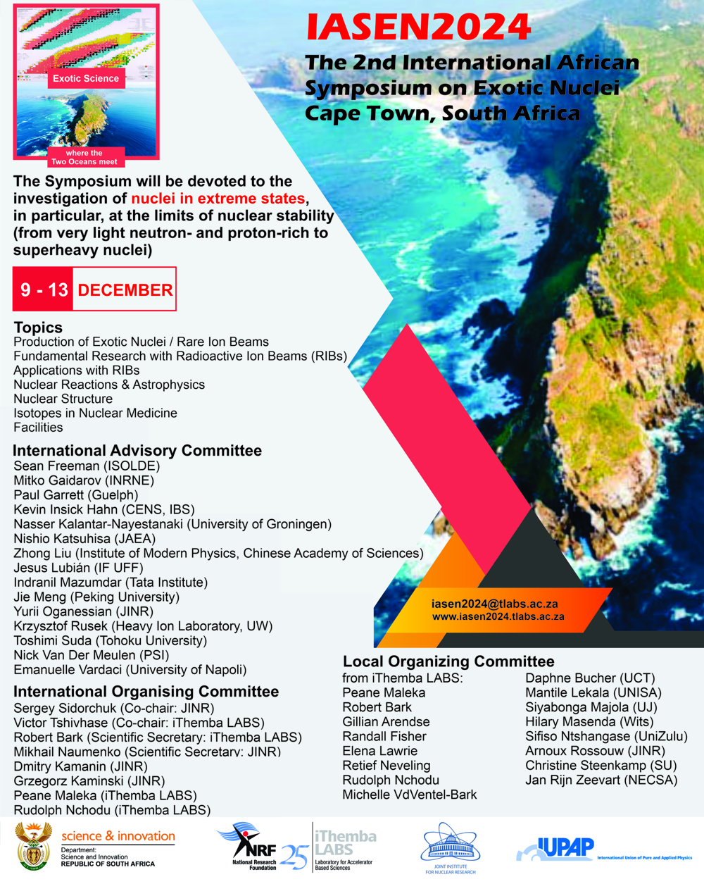 From 9 to 13 December 2024, iThemba LABS (Republic of South Africa) and the Joint Institute for Nuclear Research will organize the Second International African Symposium on Exotic Nuclei (IASEN-2024), which will take place in Cape Town, South Africa. The symposium will focus on the study of nuclei in extreme states, particularly the limits of nuclear stability (from very light neutron and proton-rich to superheavy nuclei).