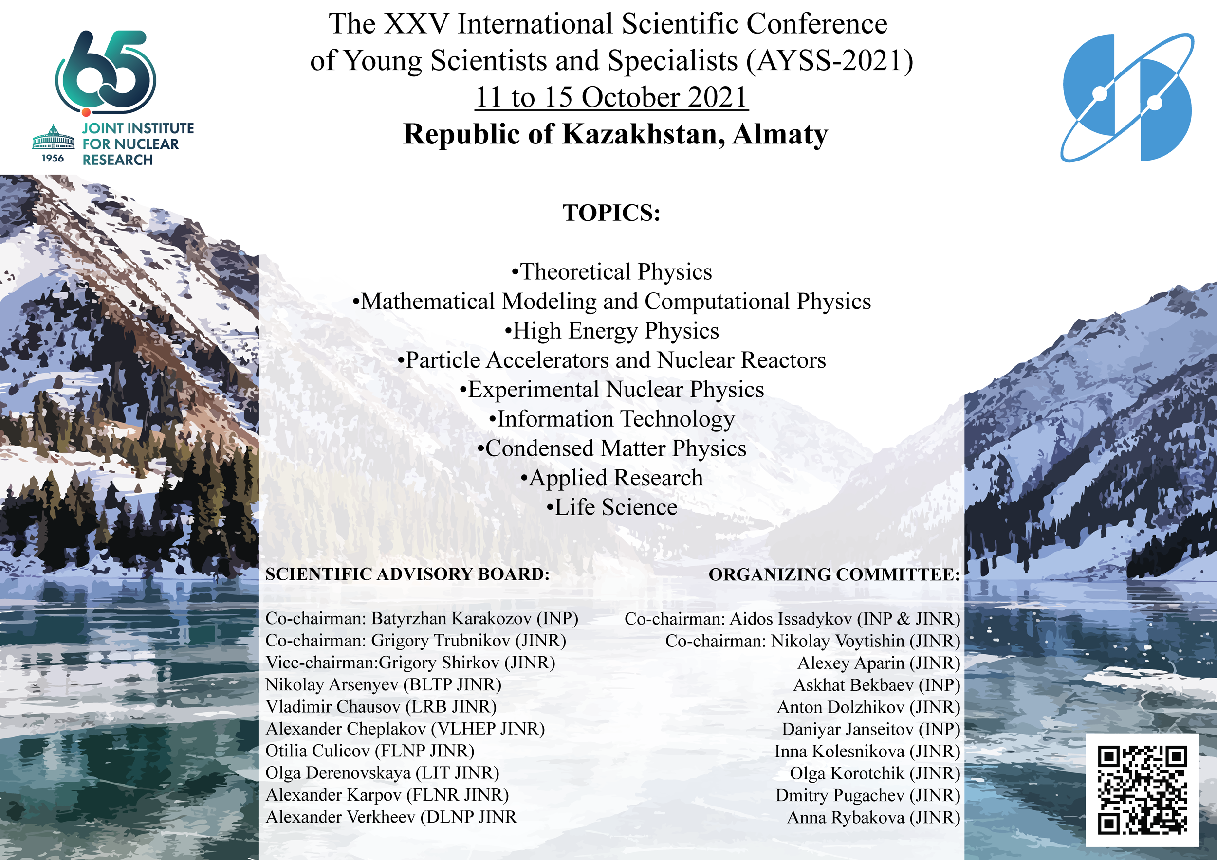 The Association of Young Scientists and Specialists of JINR kindly informs that registration for the XXV International Scientific Conference of Young Scientists and Specialists (AYSS-2021) is open. The event will take place from 11 to 15 October 2021 at the Institute of Nuclear Physics (INP) of the Ministry of Energy of the Republic of Kazakhstan, Almaty.