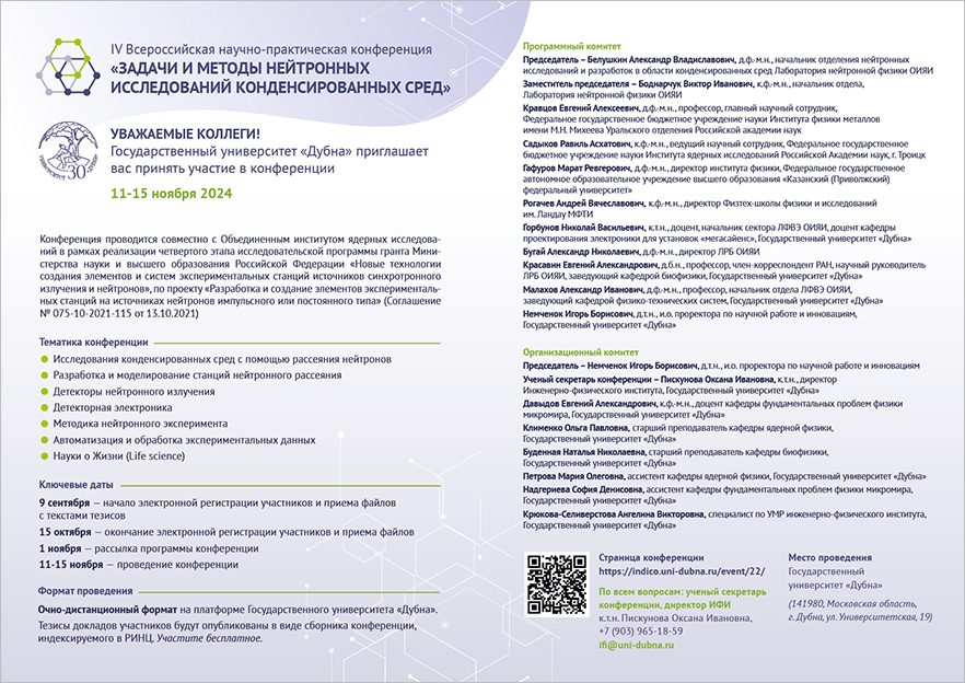 JINR employees are invited to participate in the 4th All-Russian Scientific and Practical Conference titled “Tasks and Methods of Neutron Research of Condensed Matter”, which will take place from 11 to 15 November 2024 in the hybrid format in the Dubna State University.The university and the Joint Institute are holding the conference as part of the implementation of the research grant programme of the Ministry of Science and Higher Education of Russia.