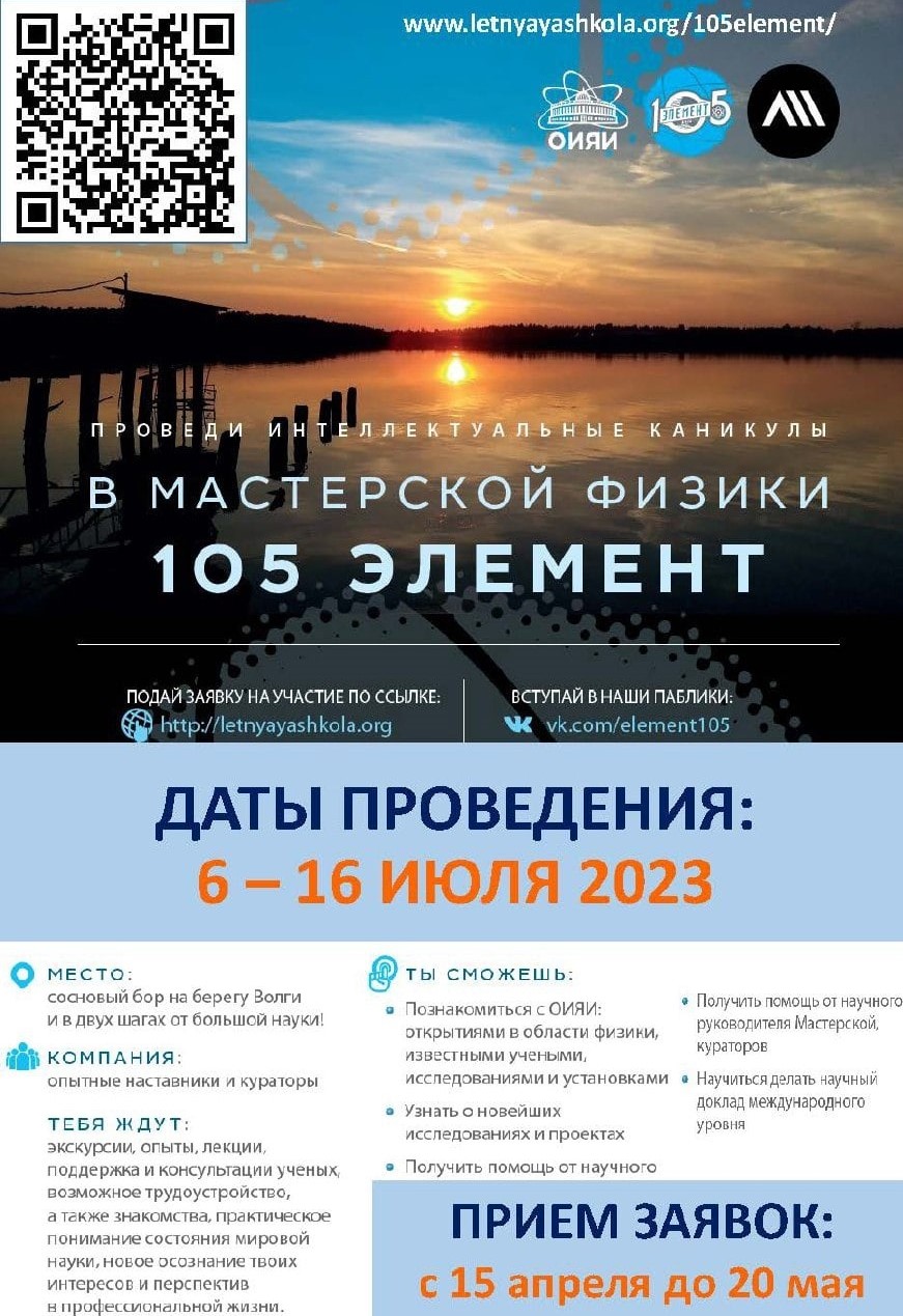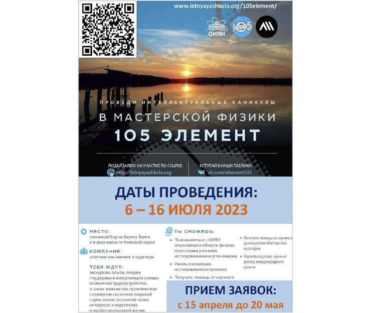Registration for the Workshop “Element 105” has opened that will be held from 6 to 16 July 2022 in the frames of the Summer School (earlier the School “Russian Journalist”) in the “Volga” recreation centre not far from Dubna. Students of courses in natural sciences and engineering aged 18 – 25: physicists, biologists, radiobiologists, programmers, electronics engineers, and engineers are invited to take part in the event.