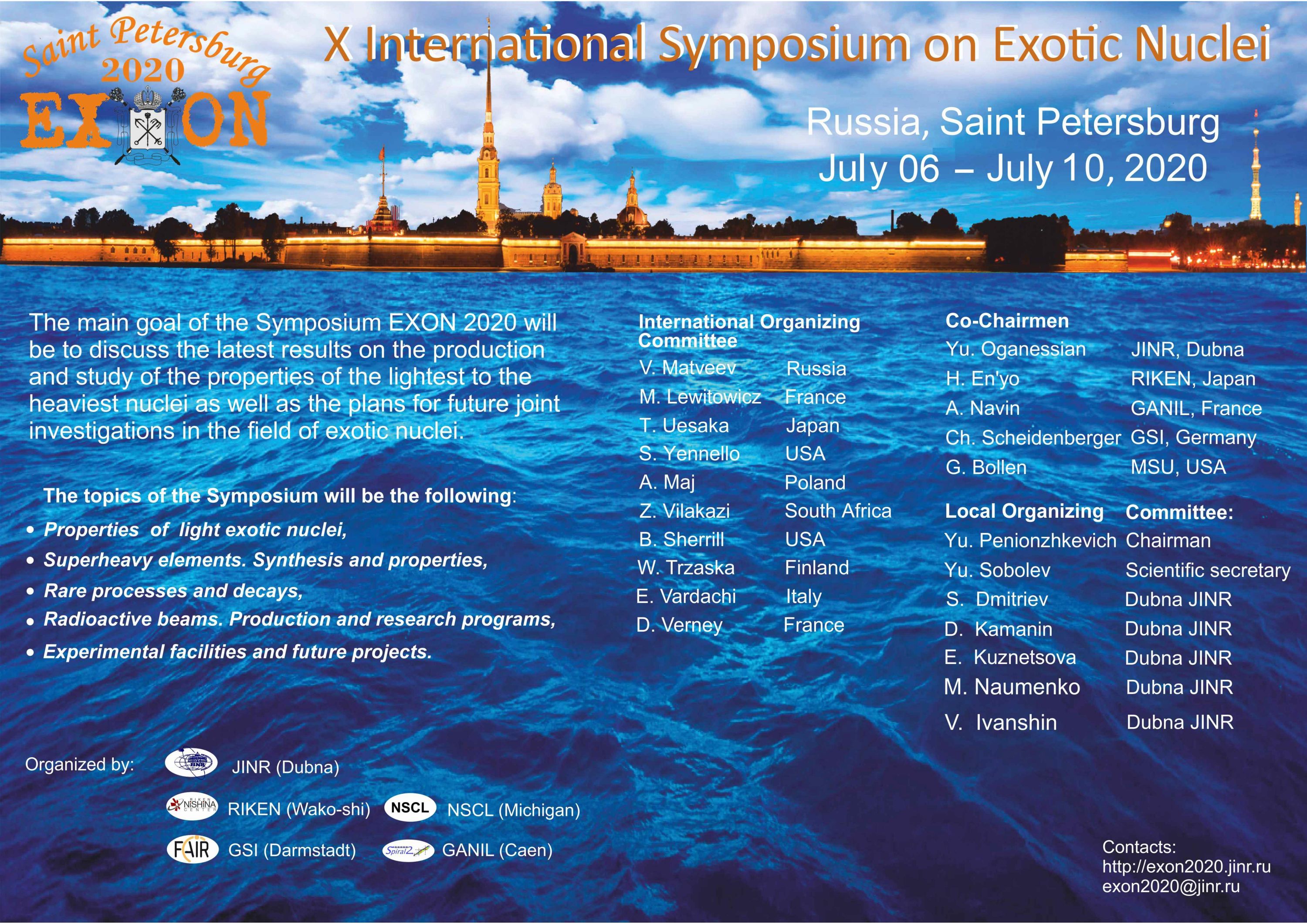 The organizers of the Symposium are JINR (Dubna), RIKEN (Japan), GSI (Germany), NSCL (Michigan, the USA), GANIL (France) – the scientific and educational centres where exotic nuclei are intensively studied.