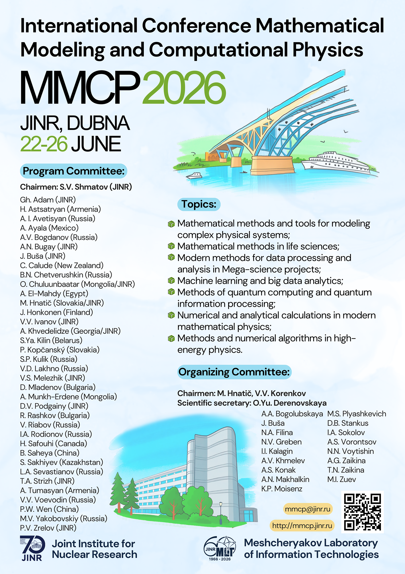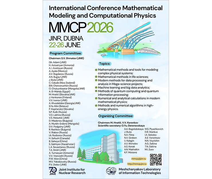 The Mescheryakov Laboratory of Information Technologies at JINR invites everyone interested to participate in the Mathematical Modeling and Computational Physics (MMCP’2026) international conference. The event will take place from 22 to 26 June 2026 at MLIT JINR.