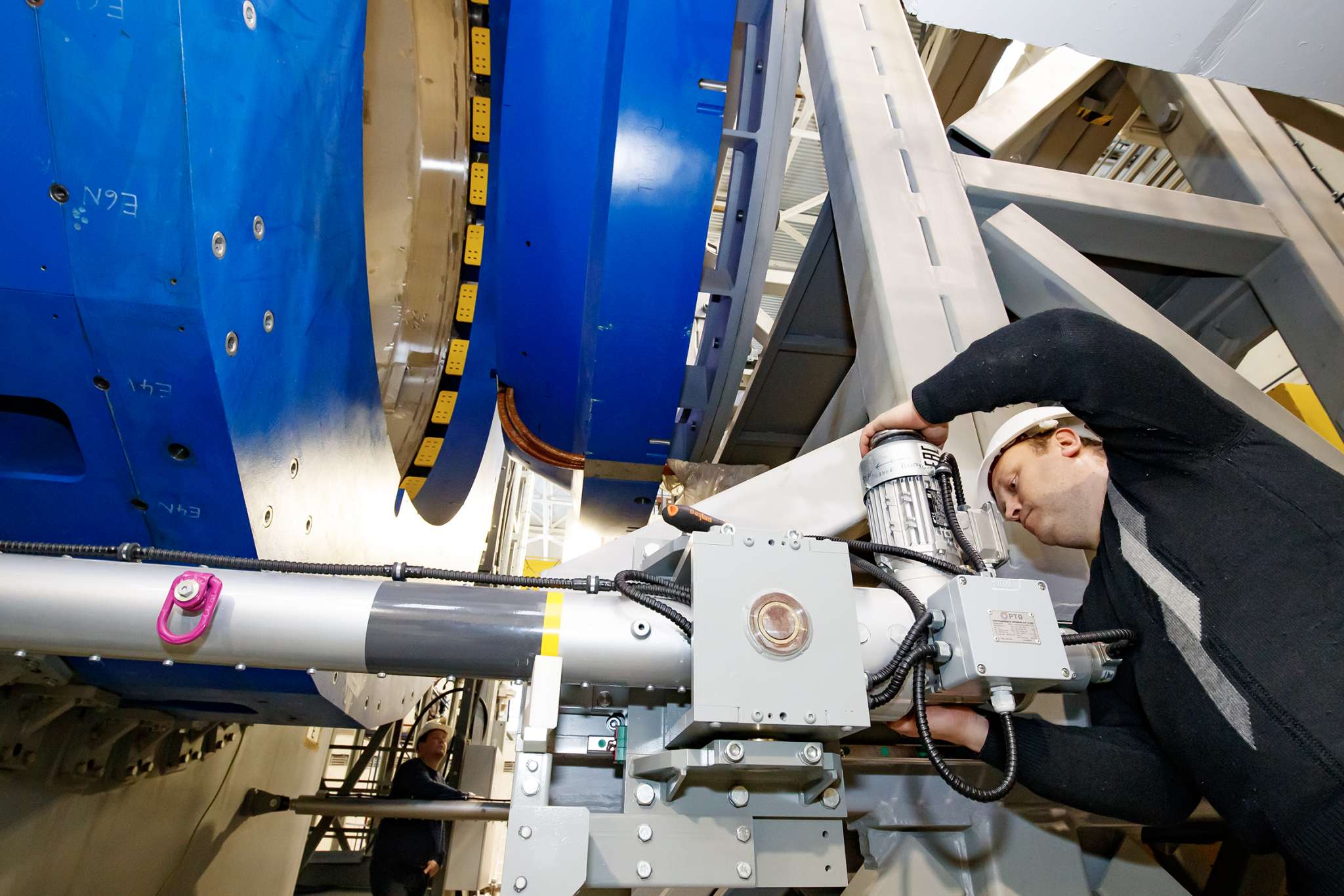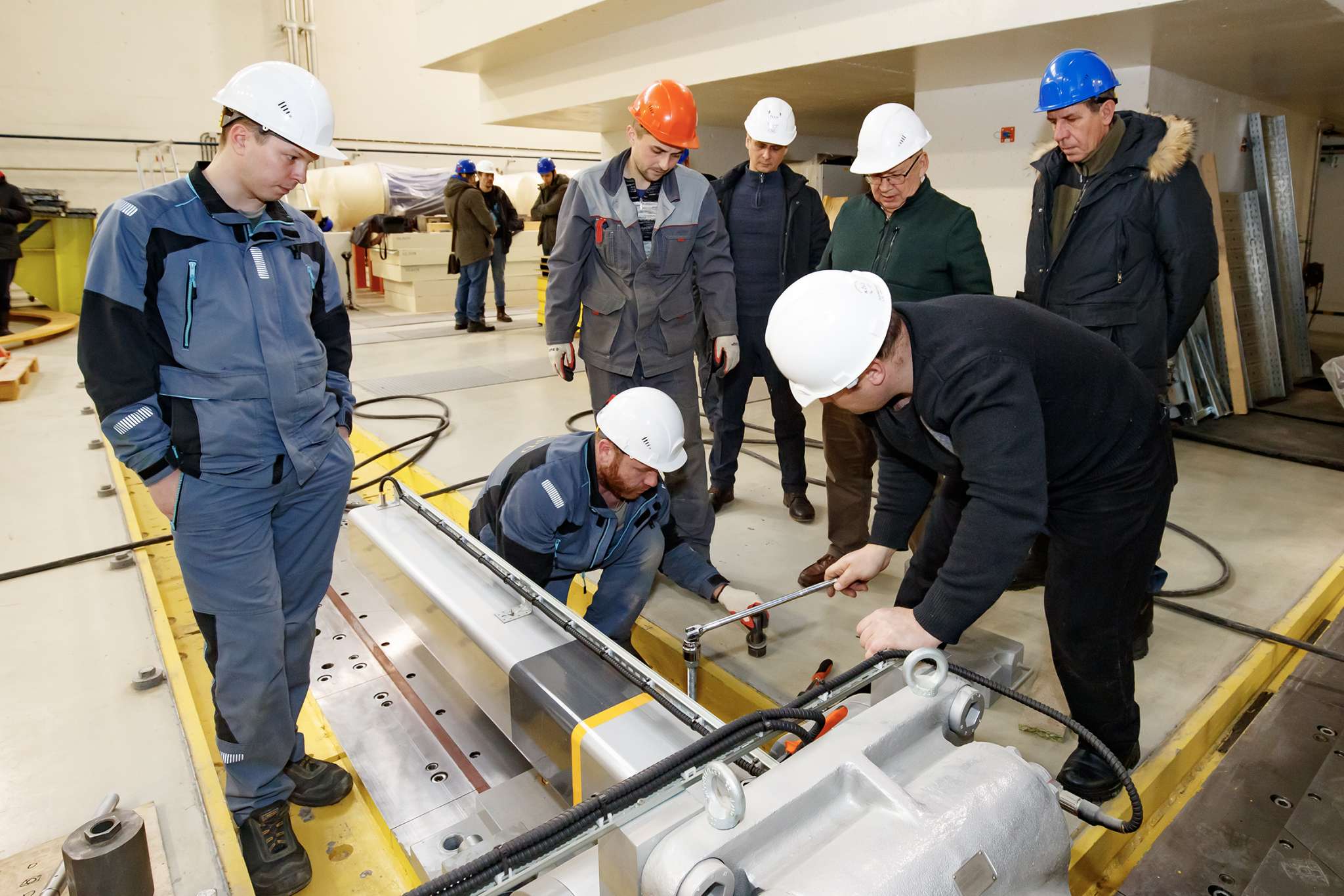 “Our task is to move the entire magnet yoke precisely to the beam axis and adjust it horizontally and vertically with an accuracy of 2 mm. The specialists will now start installing the water cooling pipes, although they won’t be connected until 2 or 3 days later, after we put the magnets in the correct position. After that, we will disconnect the pipes and return the magnet to its original position, in which it will remain for a long while – to the standard position for the installation of detectors,” Nikolai Topilin commented.