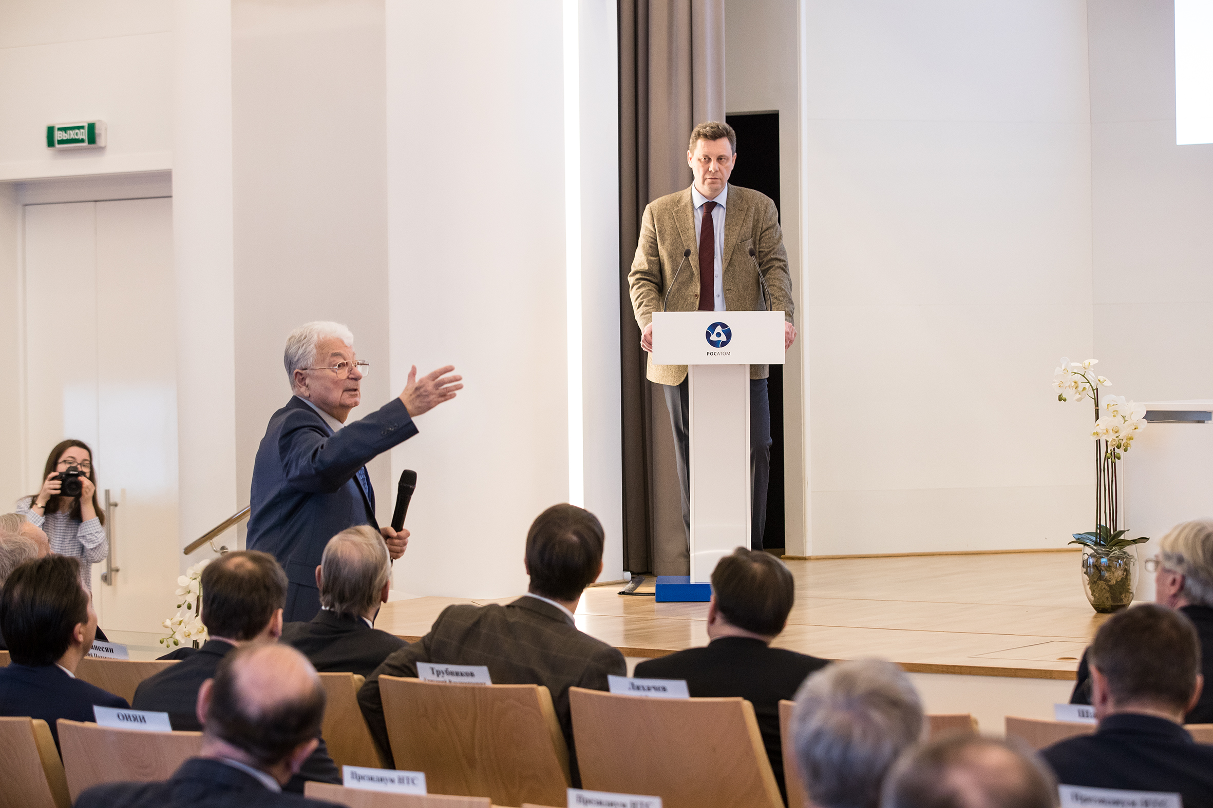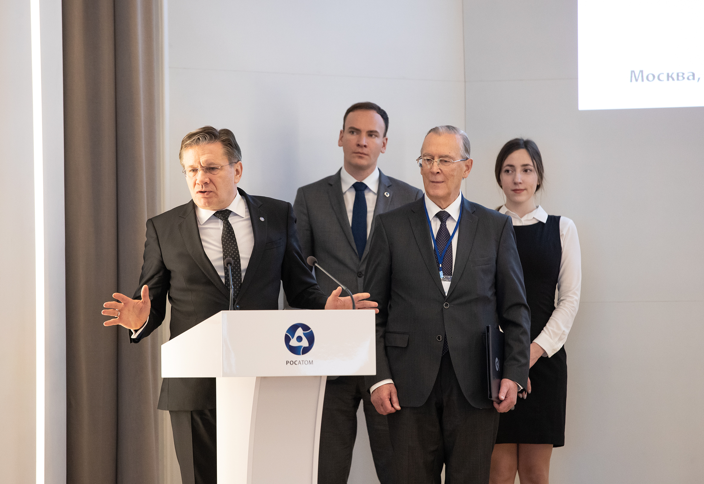 First Deputy Minister of Science and Higher Education of the Russian Federation G. V. Trubnikov welcomed participants of the meeting. He noted that in the light of plans for development of both organizations discussed here expertise in addition to manufacturing and intellectual power of Rosatom together with the level of the development of fundamental research and the international status of the Institute should give an impetus to the cooperation in terms of joint market development and coming into new markets, first of all in the fields of education and the personnel training as the basic sector of economy. The results of fundamental research conducted in the Institute, which have already reached the advanced level, may be a driving force for Rosatom to make technological developments in the 2030-2040s. Maybe it would be great to make such meetings regular.