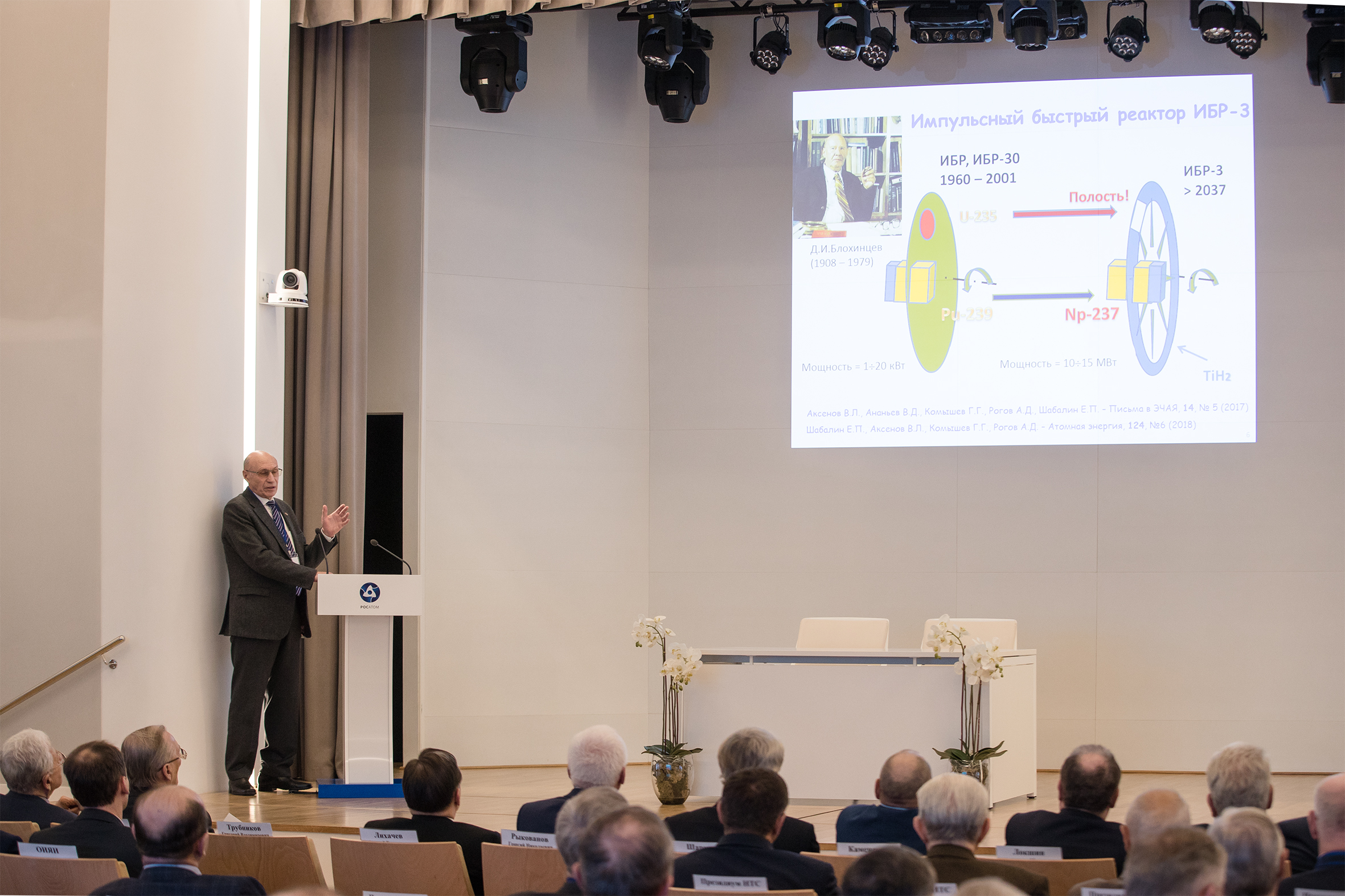 The IBR-3 fast pulse reactor was a topic of the report by FLNP Scientific Leader, RAS Corresponding Member V. L. Aksenov; the co-author of the report was A. V. Lopatkin (NIKIET).