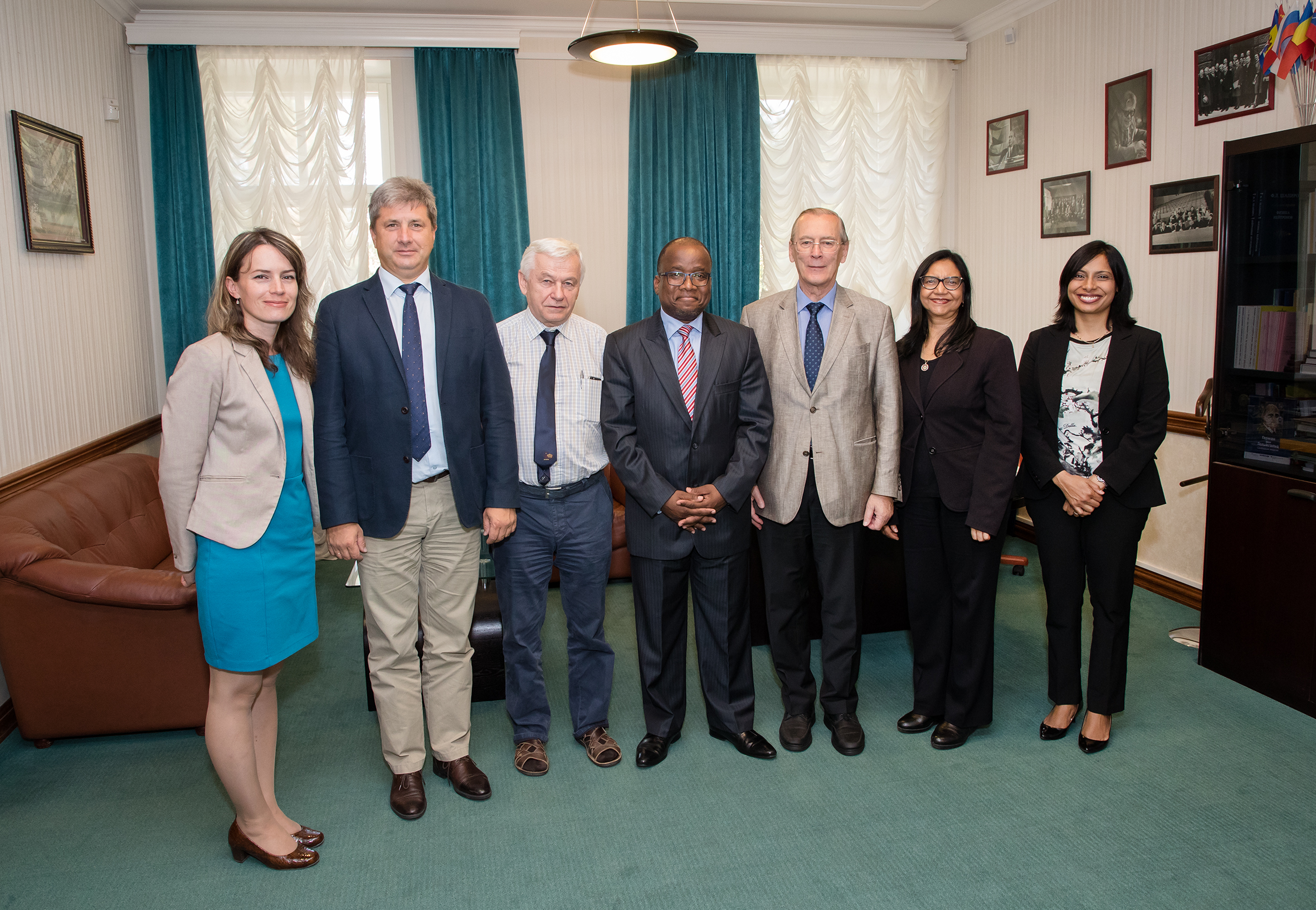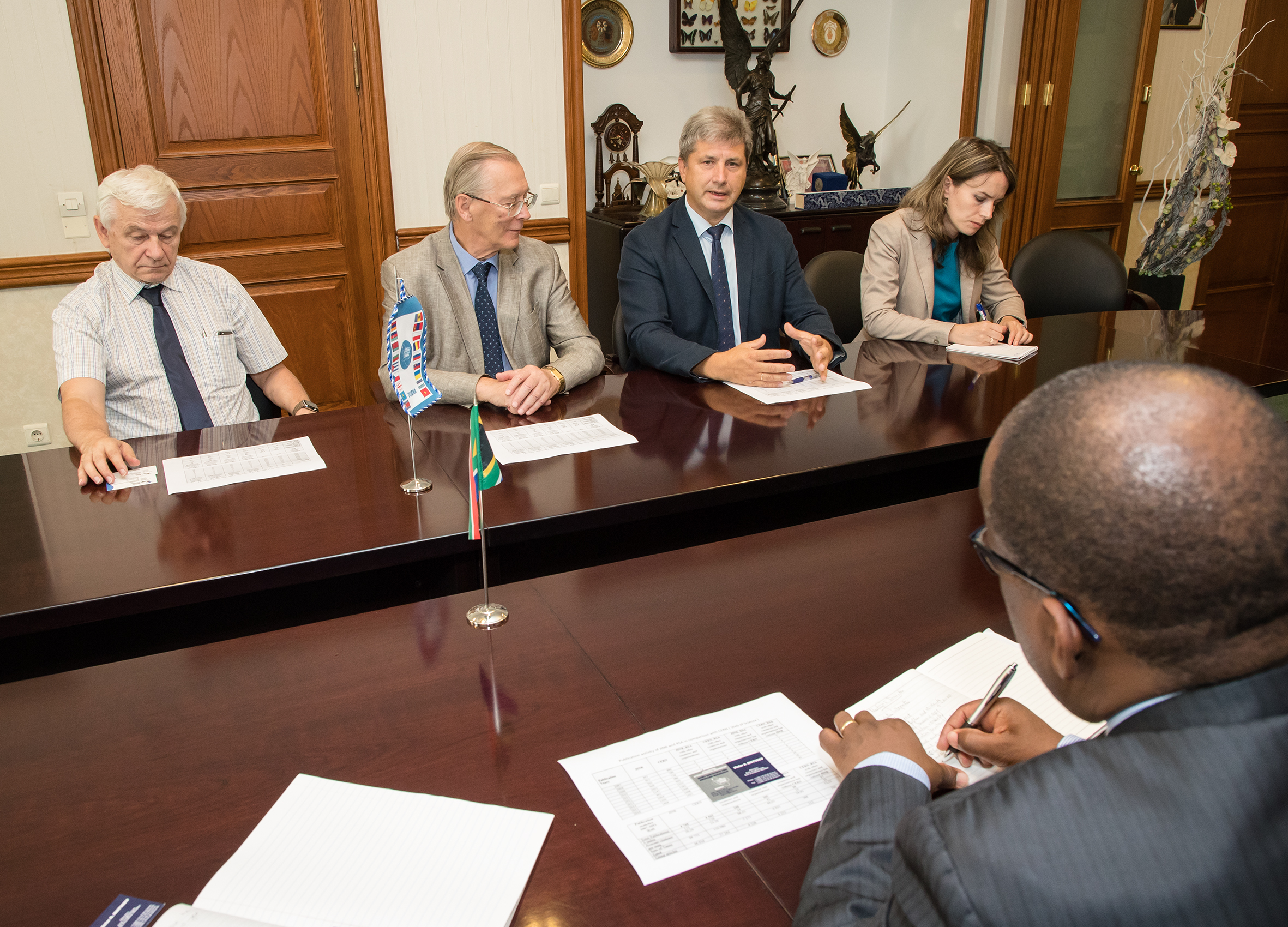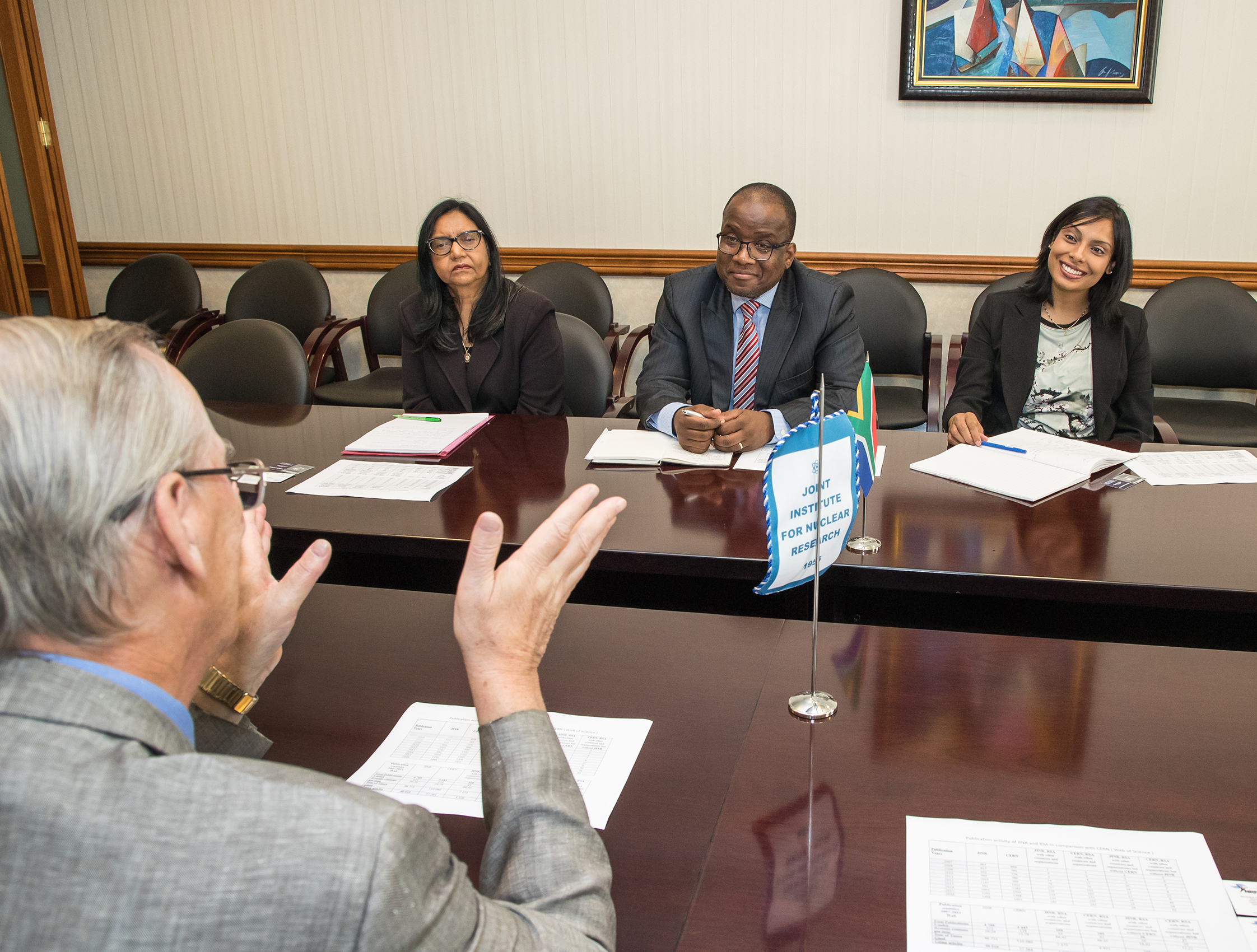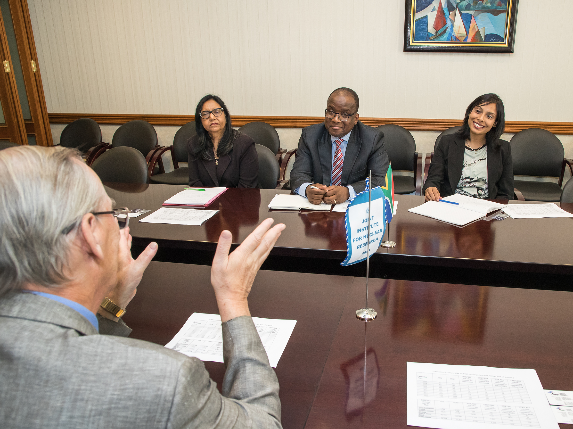 6 сентября 2018 г. заместитель генерального директора Национального исследовательского фонда Южной Африки (NRF) Клиффорд Нксомани встретился с директором ОИЯИ В.А. Матвеевым. NRF на встрече также представляли исполнительный директор по развитию кадрового и инфраструктурного потенциала Ромилла Махарадж и директор по развитию кадрового и инфраструктурного потенциала Ракешни Рамутар-Приешл. Со стороны ОИЯИ во встрече приняли участие вице-директор ОИЯИ Р. Ледницки, начальник Отдела международного сотрудничества ОИЯИ Д.В. Каманин и секретарь Объединенного координационного комитета по сотрудничеству ЮАР-ОИЯИ А.А. Котова.