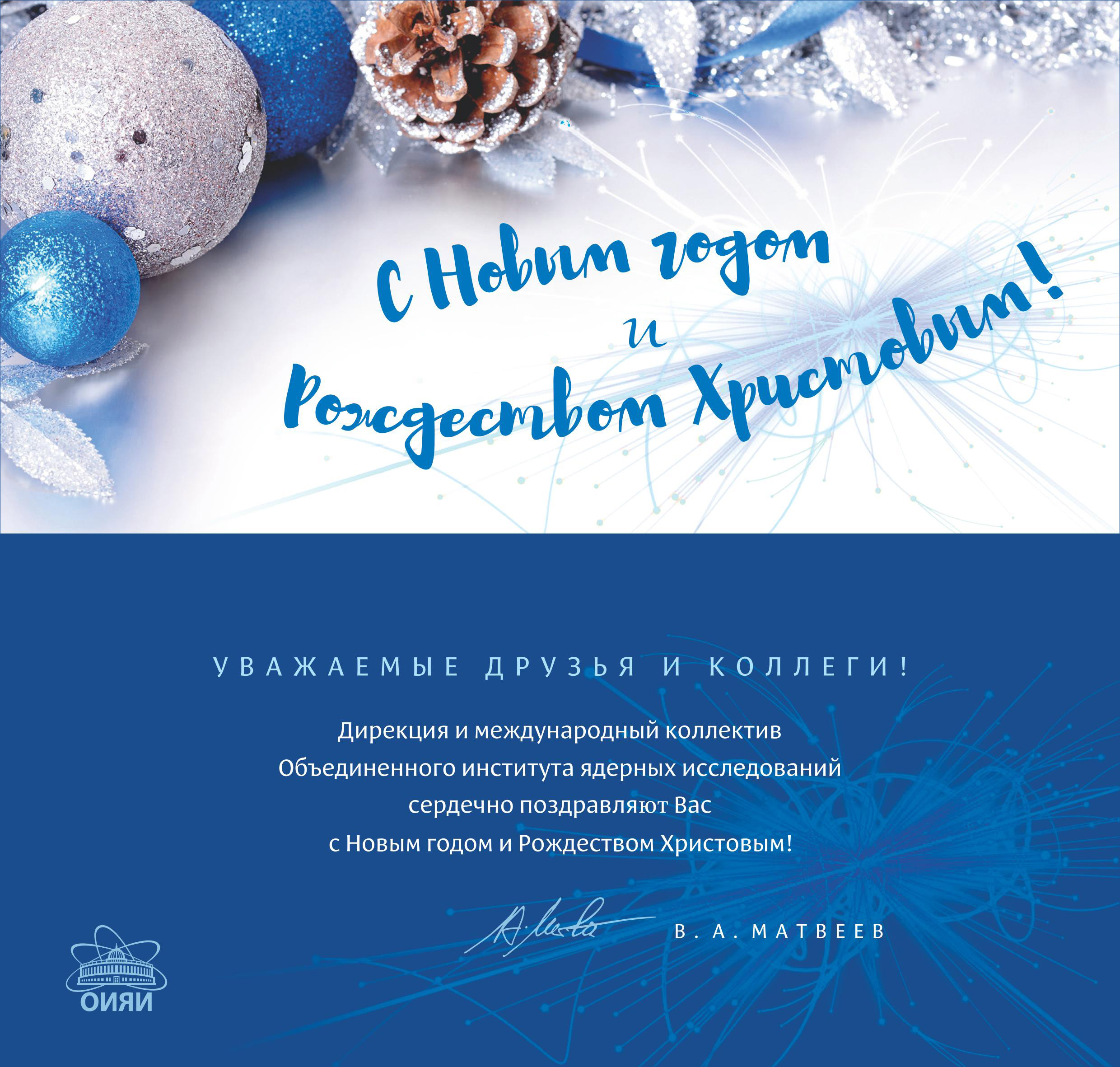 Поздравляю многонациональный коллектив нашего Института, всех наших партнеров, которые работают в странах-участницах ОИЯИ, и, конечно, всех жителей города с наступающим новым 2018 годом и светлым праздником Рождества. Думаю, мы имеем все основания смотреть в будущее с надеждой и оптимизмом. Будьте здоровы, будьте счастливы!