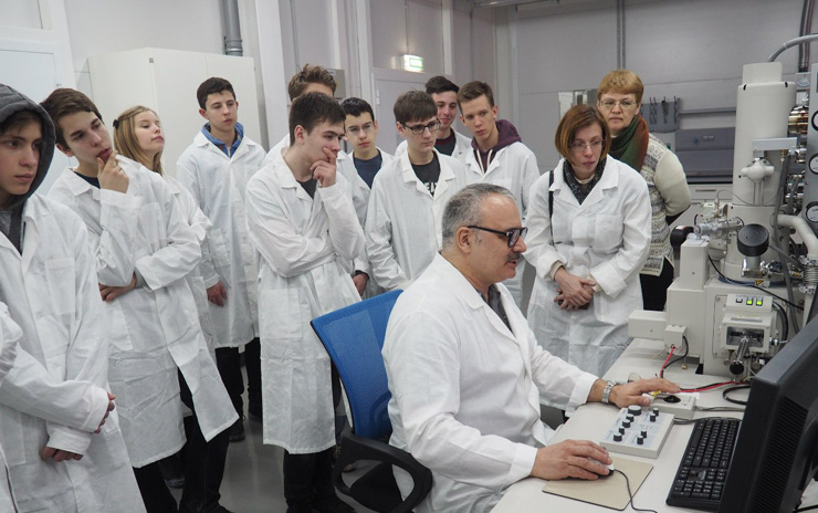 FLNR senior researcher A.Artyukh delivered an introductory lecture on the laboratory fields of research, as well as he acquainted the students with the IC-100 and U-400M accelerators. The Nanolab staff member O.Orelovich gave the guests a demonstration of operation of the modern electron microscope.