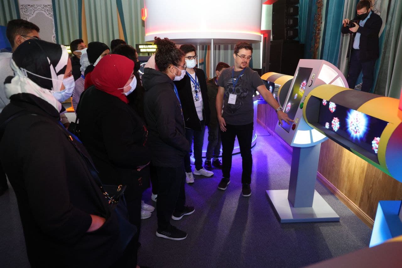The task of the Science School is to introduce young guests from Egypt to the laboratories, research, and employees of the Institute. The programme of the event started at the interactive exhibition dedicated to the 65th anniversary of JINR, where participants and their attendants, including Vice-President of the Academy of Scientific Research and Technology Gina El-Feky, were greeted by Head of the JINR International Cooperation Department Dmitry Kamanin. He expressed hope that in the future the guests would be able to return to JINR as students to participate in the student practices of the UC and then as researchers to contribute to science. Alexander Verkheev, Deputy Director of the JINR University Centre welcomed the guests. Nikita Sidorov, a VBLHEP software engineer conducted a tour of the exhibition for the schoolchildren and introduced them to the history of the Institute. Wael Badawy, Head of the national group of Egypt in JINR, attended the event.