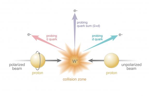 The proton spin puzzle: Scientists want to know how different constituents of the proton contribute to its spin, a fundamental property that plays a role in how these building blocks give rise to nearly all visible matter in the universe. Pieces of the puzzle include the orbital angular momentum of quarks and gluons, gluon spin and quark and antiquark spin. The latest data from RHIC reveal that the antiquarks’ contribution is more complex than previously thought.