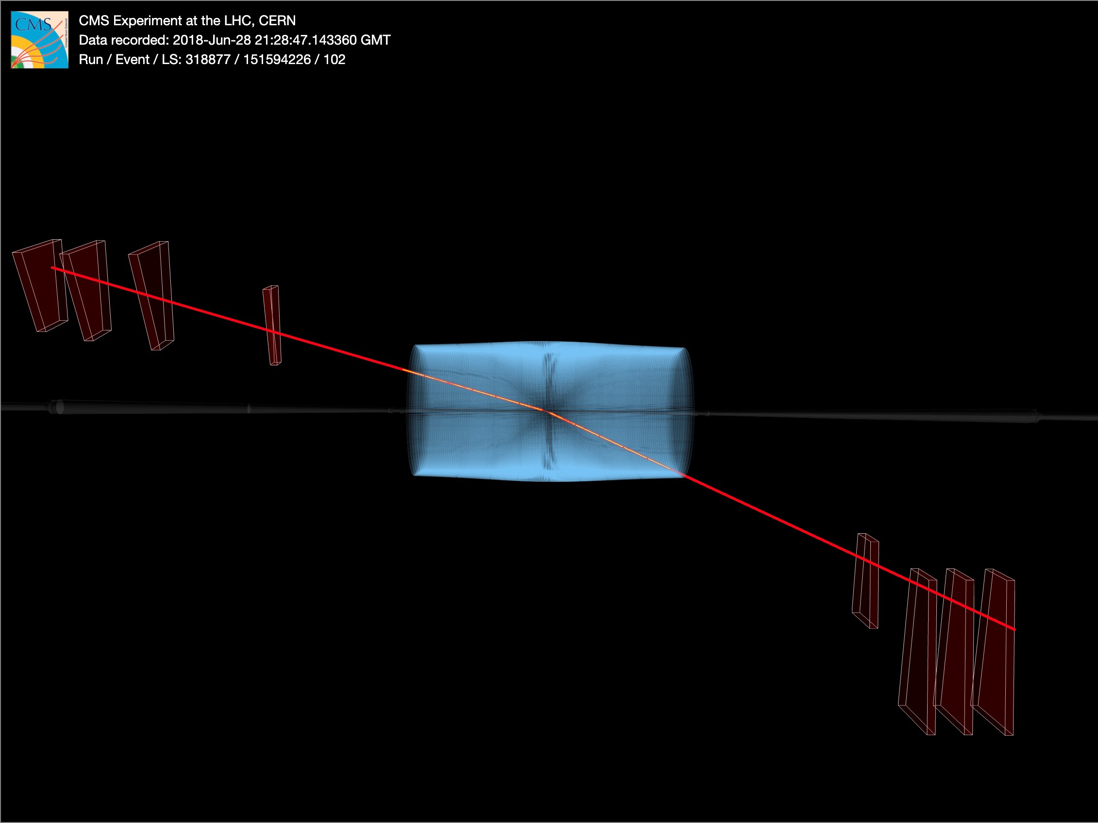 Figure 4: Highest dimuon mass candidate found in the Run 2 dataset, corresponding to a mass of 3.34 TeV. All particles besides muons and their energy deposits have been removed. Muon trajectories are shown as red lines.
