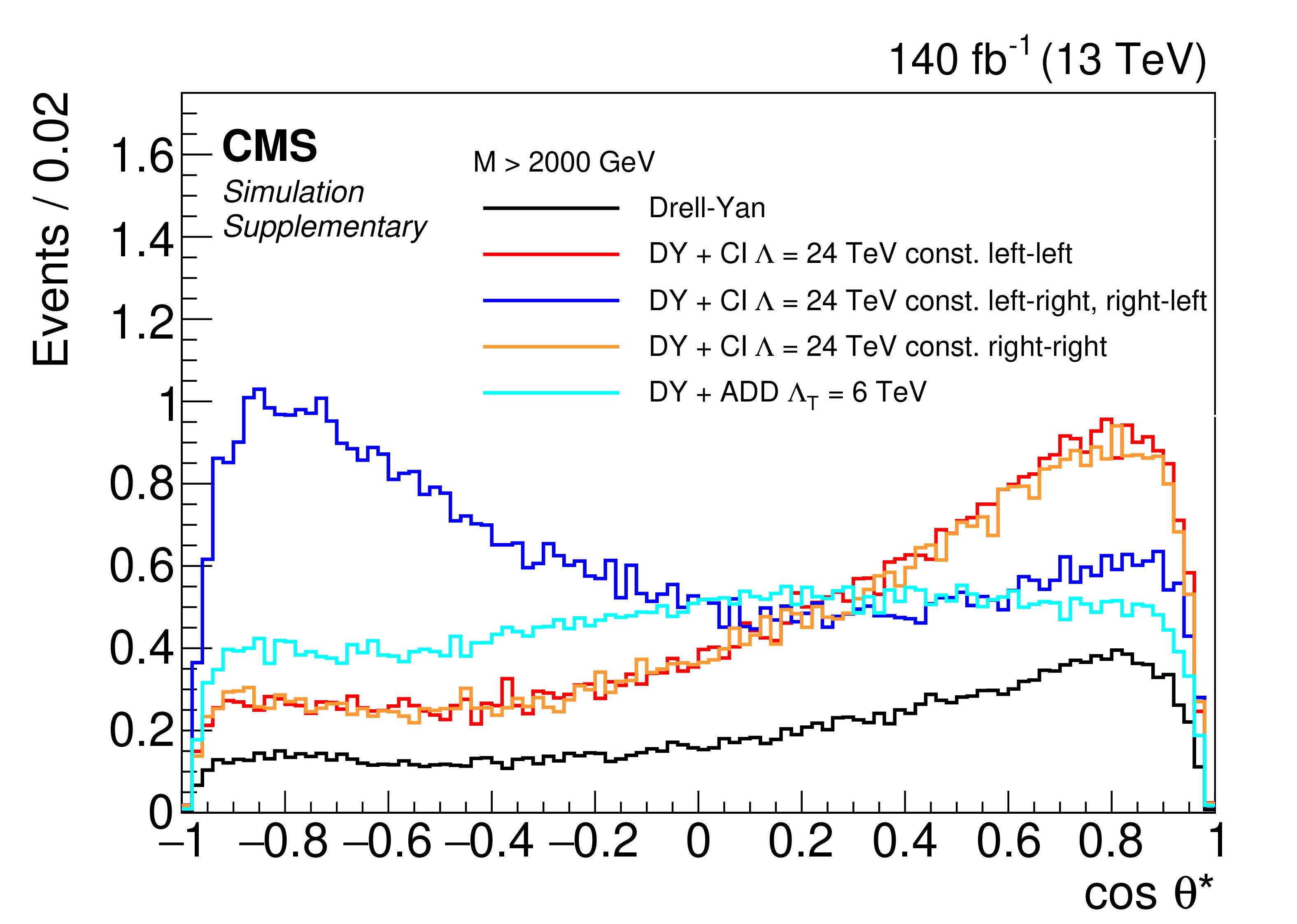 Figure 5: The distribution of the cosine of the scattering angle θ* for events with dilepton mass above 2000 GeV. The dominant Drell-Yan background is shown in black, whereas the distribution expected in different signals is shown in other colors.