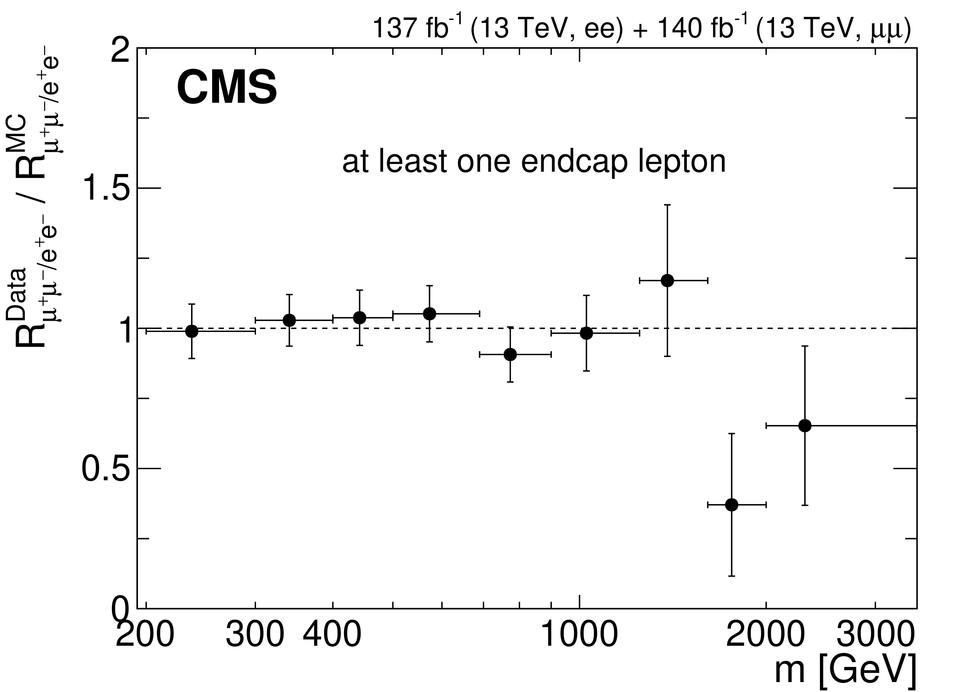 One of the rules of the standard model is that bosons such as the Z boson will decay equally into muons and electrons. But if the standard model is incomplete, the data could show a preference for one type of lepton over the other. We searched for this at high masses for the first time! Unfortunately, we didn’t see strong evidence of any preference (although there were some small deviations due to an excess of electron events, which we should keep an eye on in the future). Figure 6 shows the ratio we observed.
