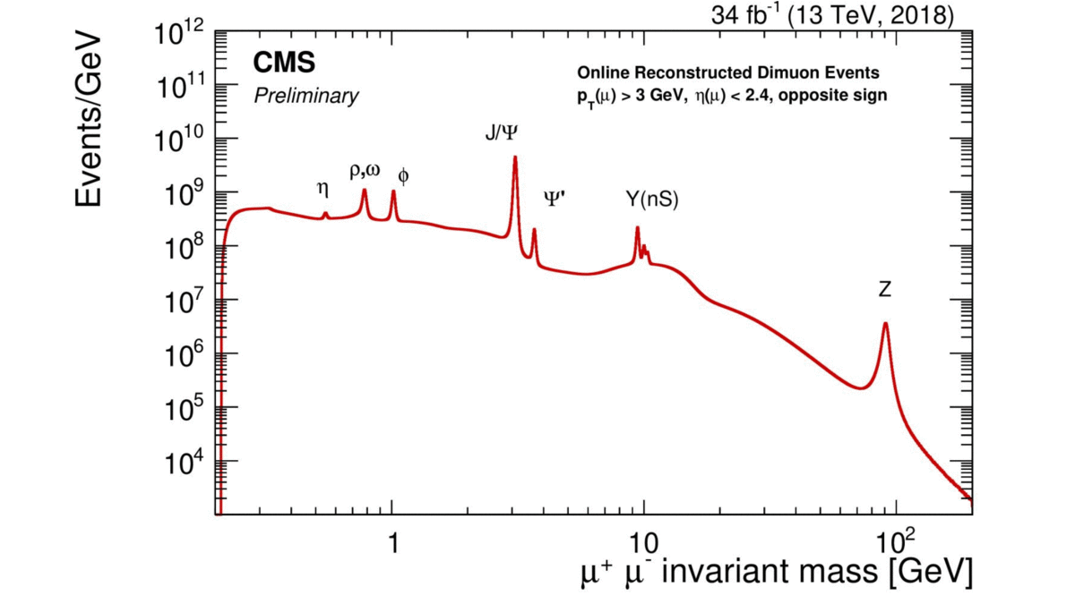 We build on a long history of discovering new particles in dilepton final states with this search. Some examples of this include the J/ψ meson discovered in 1974 at SLAC and BNL, the Y meson discovered in 1977 at Fermilab and the Z boson discovered in 1983 at CERN. What were rare new particles decades ago are now produced in large numbers at the LHC? This is highlighted in Figure 1, which shows the dimuon mass spectrum observed by CMS with peaks in the distribution corresponding to resonantly produced particles. With our search, we push far into the unexplored high mass region of this distribution in the hopes of again discovering something new.