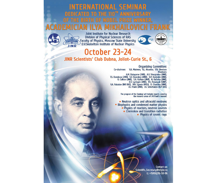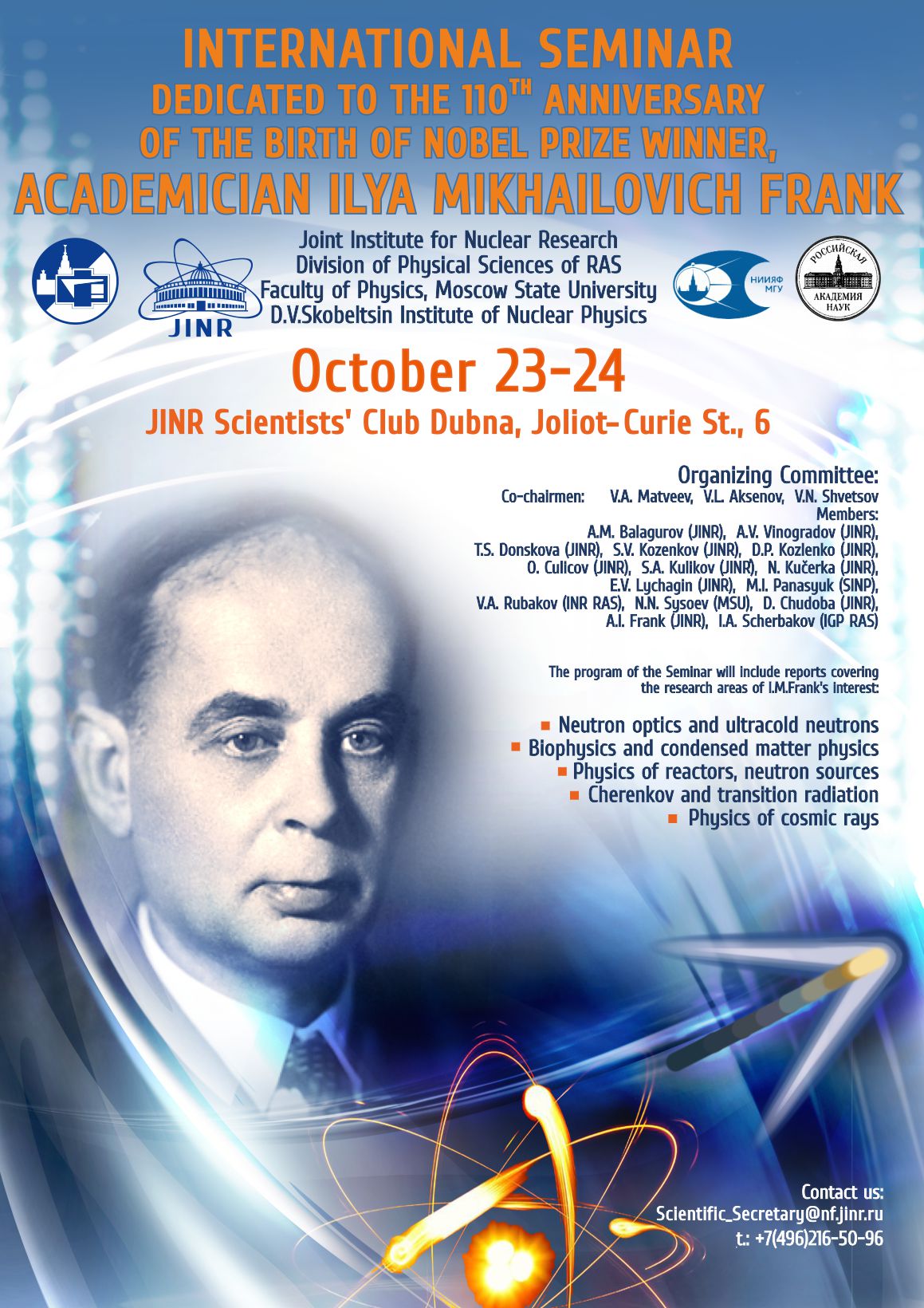 On 23 October 2018, we celebrate the 110th anniversary of the Nobel and State prizes winner, organizer and long-term Director of the Laboratory of Neutron Physics of JINR Academician Ilya Mikhailovich Frank. The Directorate of the Frank Laboratory of Neutron Physics invites you to take part in the international seminar organized by the Joint Institute for Nuclear Research jointly with the Russian Academy of Sciences on 23-24 October 2018.