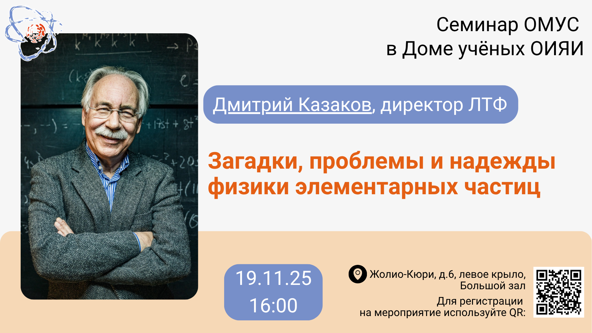 19 ноября 2025 г. в 16:00 Объединение молодых ученых и специалистов ОИЯИ приглашает на очередной семинар в большом зале Дома ученых ОИЯИ (ул. Жолио-Кюри, 6, левое крыло).