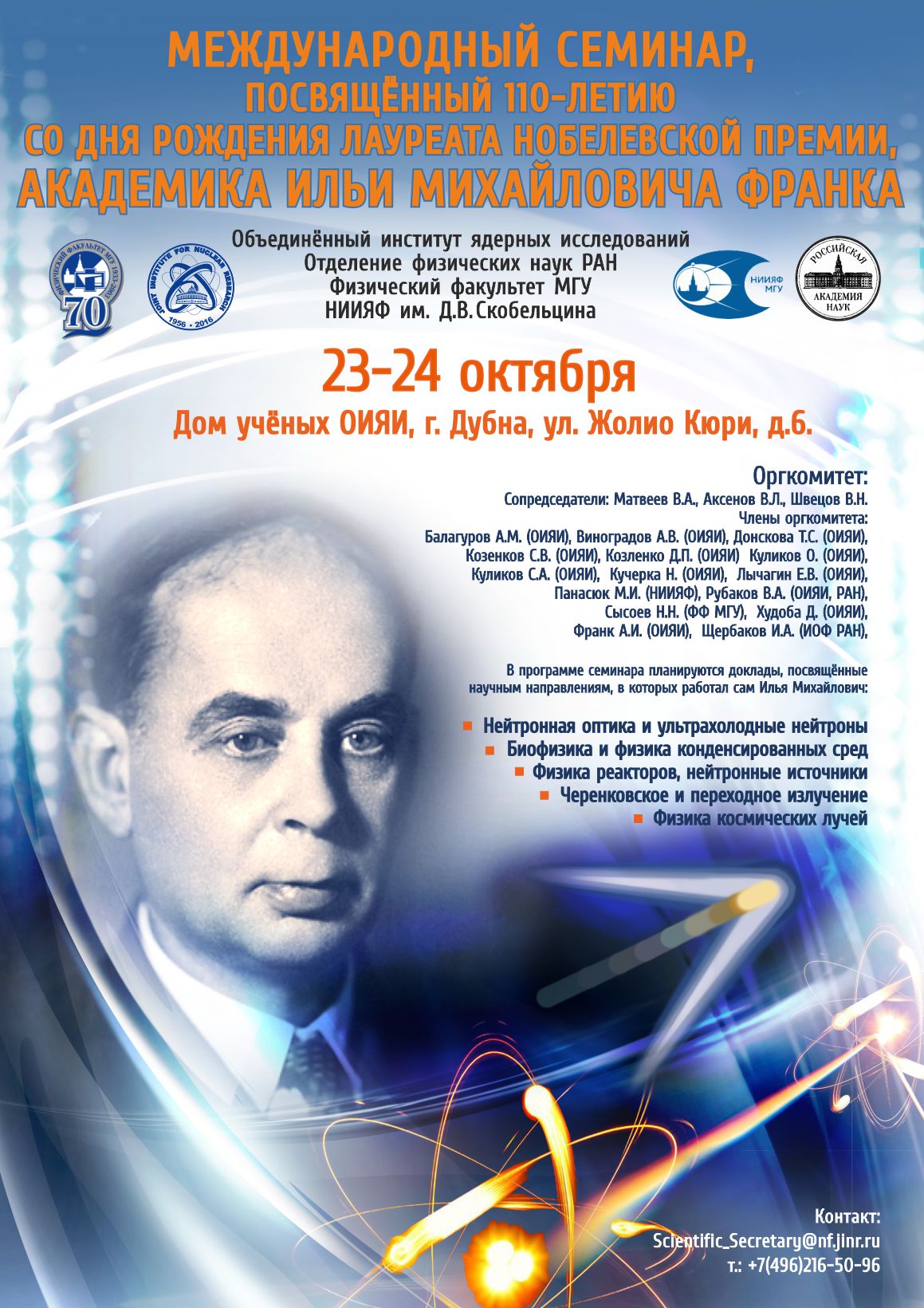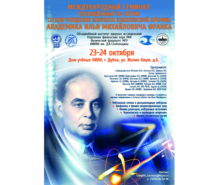 23 октября 2018 года исполняется 110 лет со дня рождения лауреата Нобелевской и государственных премий, организатора и многолетнего руководителя Лаборатории нейтронной физики Объединенного института ядерных исследований академика Ильи Михайловича Франка. Дирекция Лаборатории нейтронной физики им. И.М. Франка приглашает принять участие в международном семинаре, который организует Объединенный институт ядерных исследований совместно с Российской академией наук 23-24 октября 2018 г.